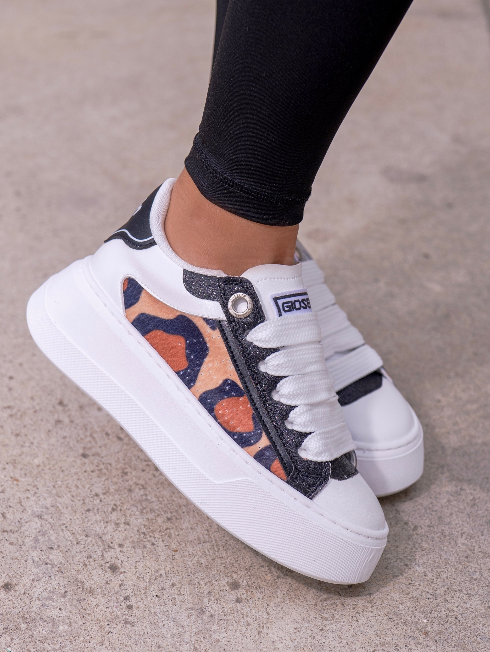 Crafted with a sporty and contemporary silhouette , this sneaker is characterised by the unmistakable animalier print , made even more aggressive by the black glitter inserts that give light and personality to every step .