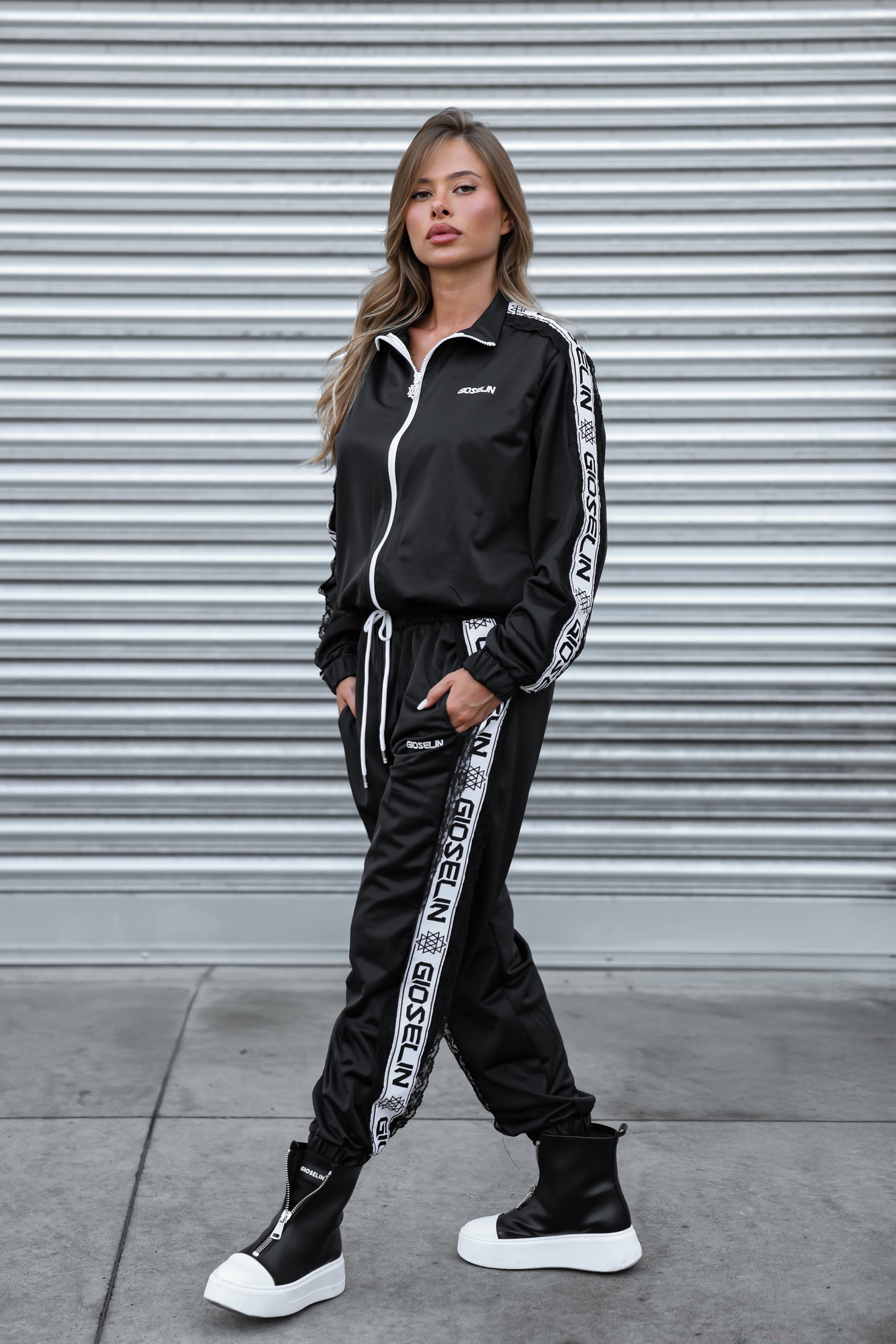 Crafted from soft, snug, and shiny technical acetate , this jumpsuit—sold as a matching set —consists of a zip-up jacket and trousers with an adjustable waist. But what makes it unique is the enchanting detail: refined, lacy lace embroidery along the sleeves and side panels of the trousers. An elegant and sophisticated touch that contrasts with the powerful, maxi-print Gioselin logo.