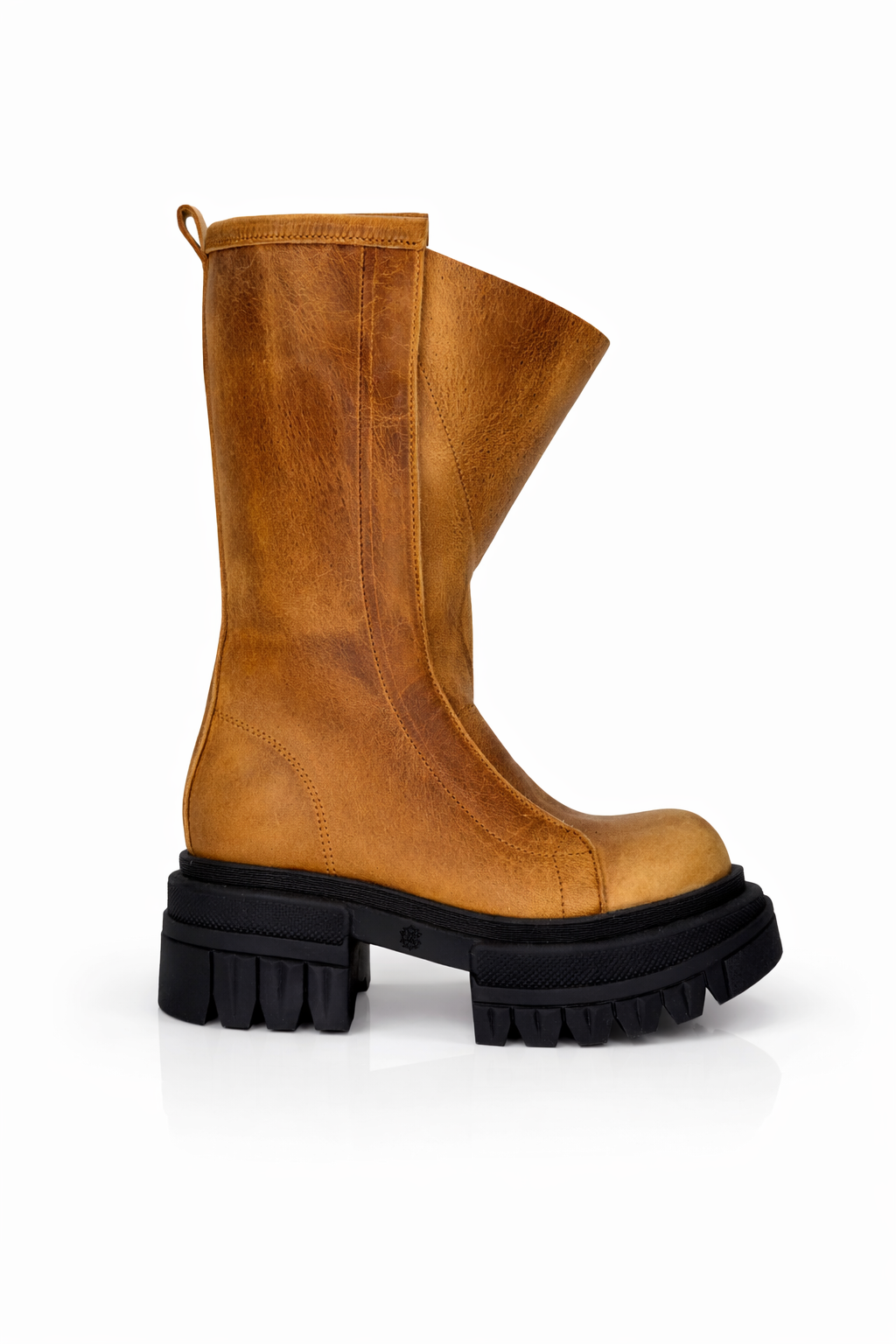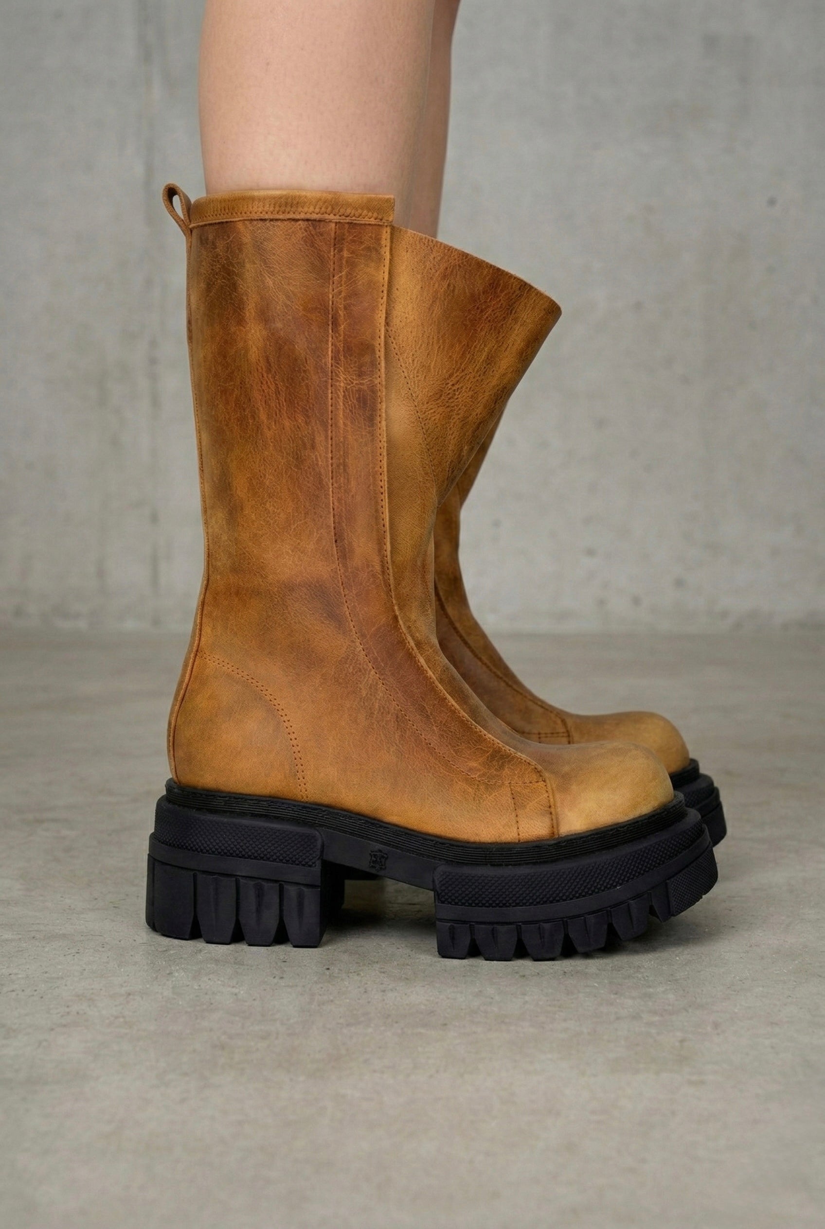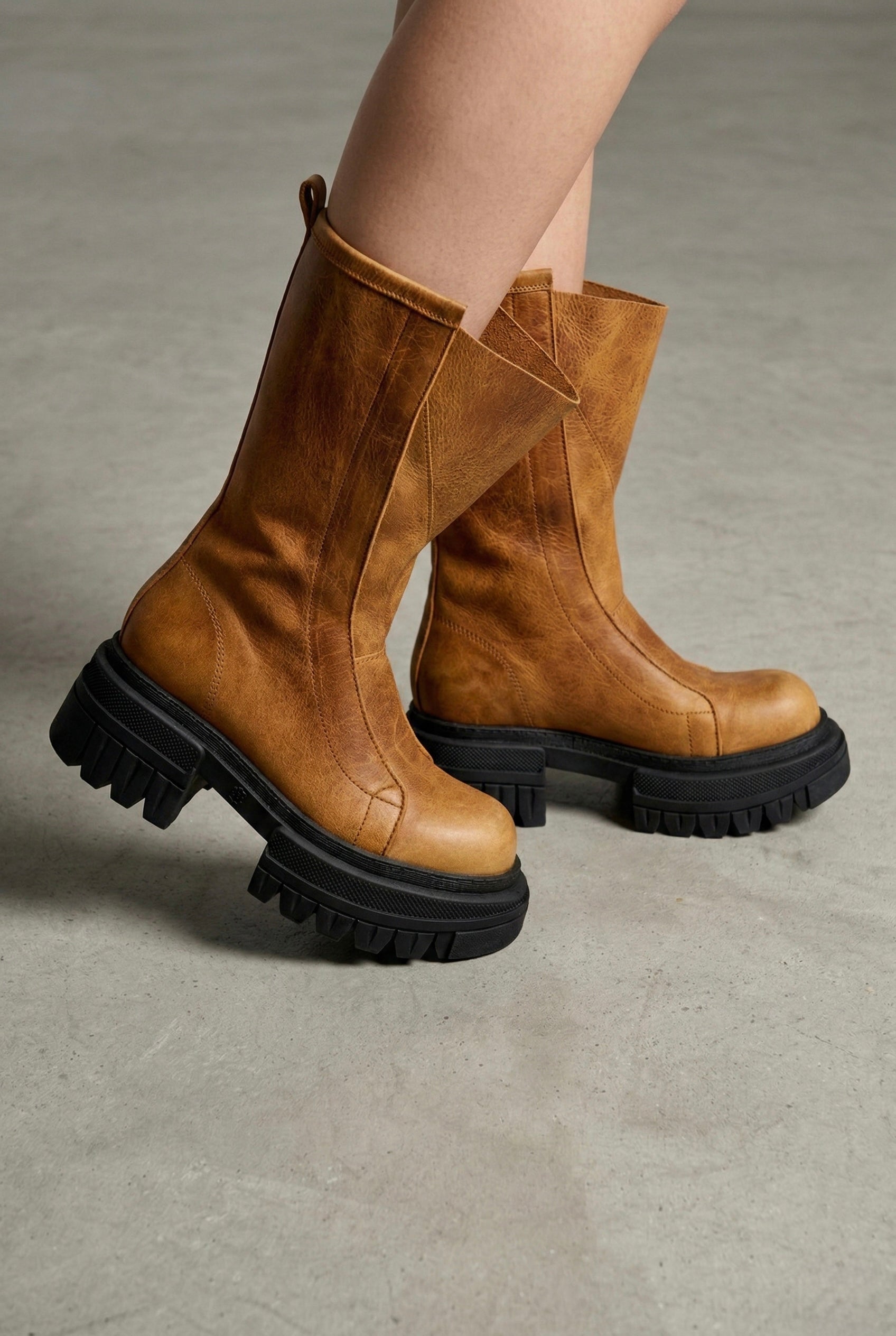 La linea essenziale e pulita esalta la nobiltà della pelle, mentre la suola carrarmato platform introduce un contrasto moderno che conferisce presenza scenica e stabilità. La costruzione mid-calf avvolge la gamba offrendo comfort e supporto, rendendo lo stivale ideale per look dal gusto urban-luxury e combinazioni più ricercate.