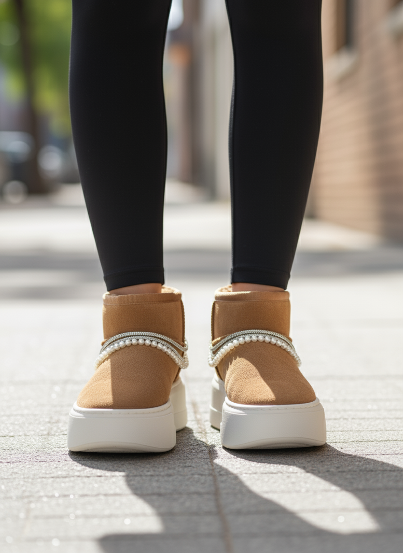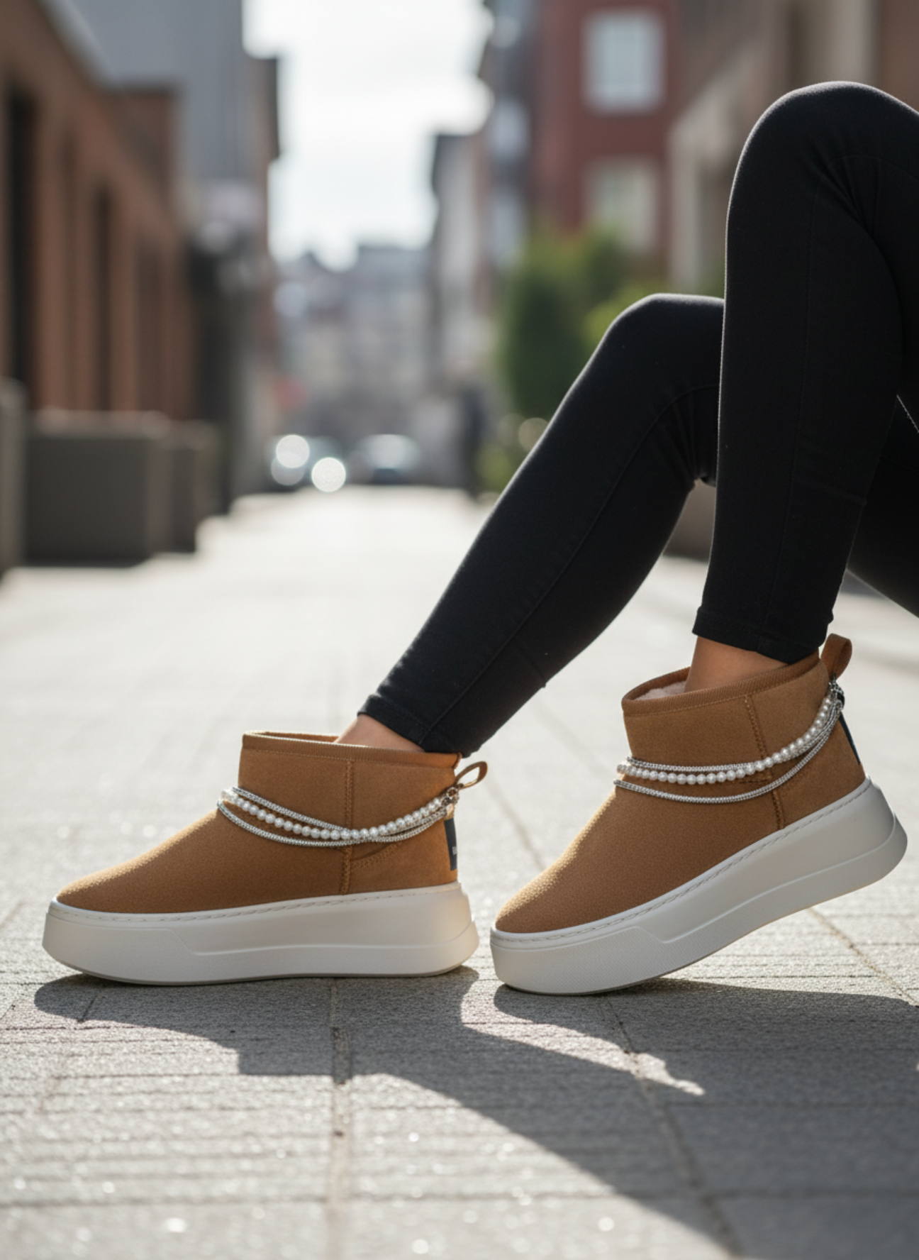 It's highlighted by an exclusive detail: a double chain of pearls and micro rhinestones that elegantly wraps around the upper, creating a perfect contrast with the warm, natural camel hue. A touch of sparkle that makes this model unique and irresistible.
