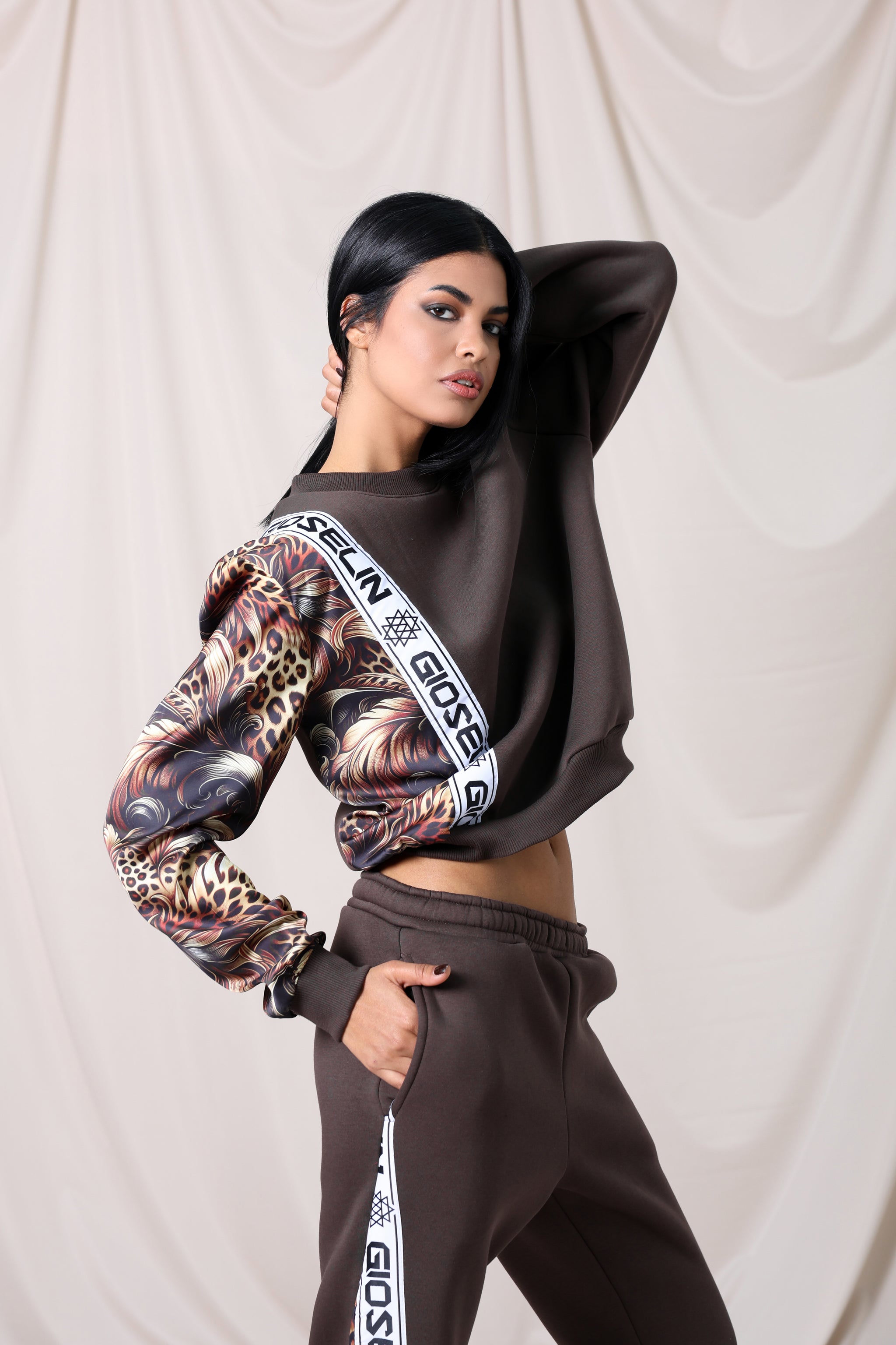 The sweatshirt features a modern fit with an elasticated hem and exclusive satin details with a baroque/wild theme, adding a touch of brightness and uniqueness to the look. The trousers , with an elasticated waist, feature a refined flared cut that slims the silhouette while maintaining maximum comfort.