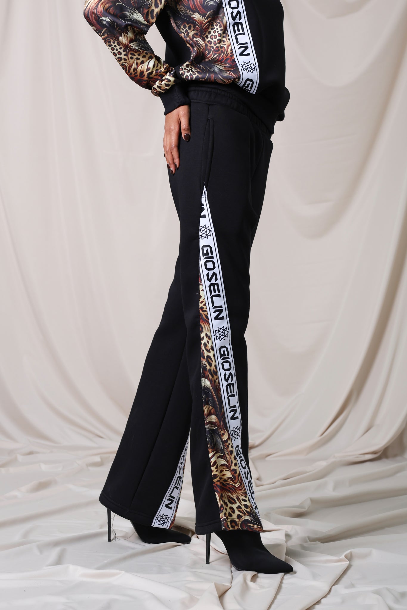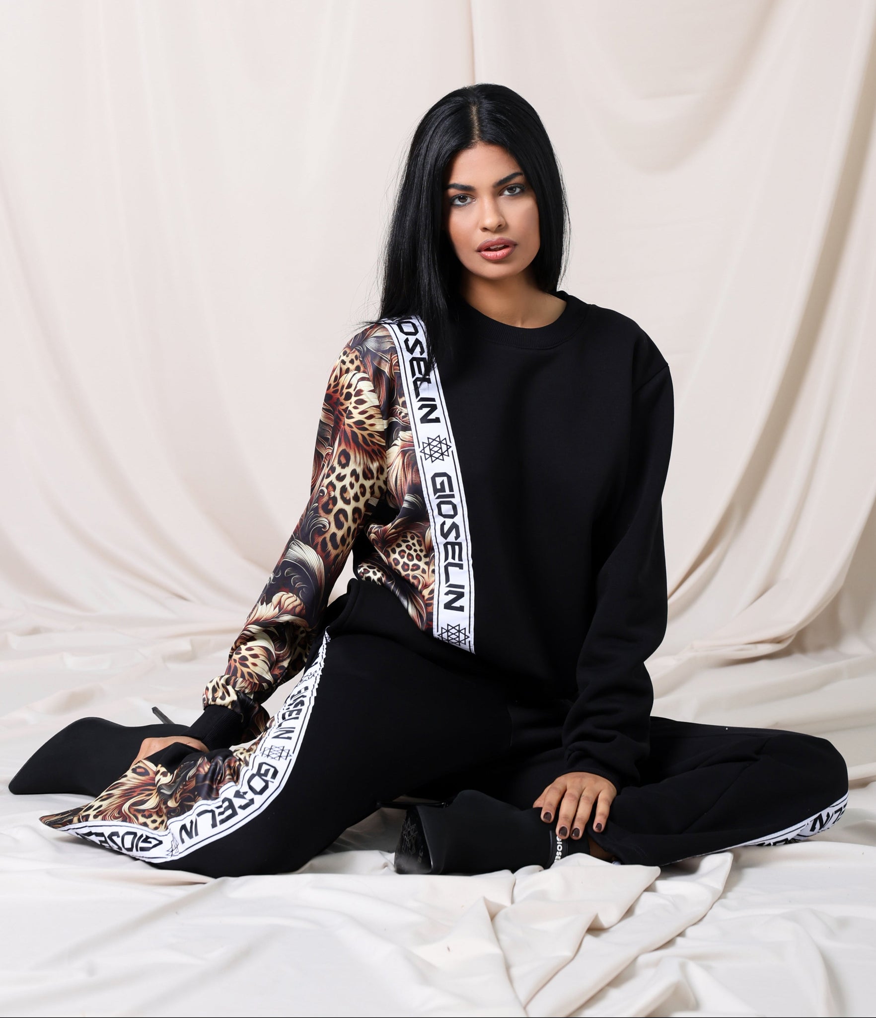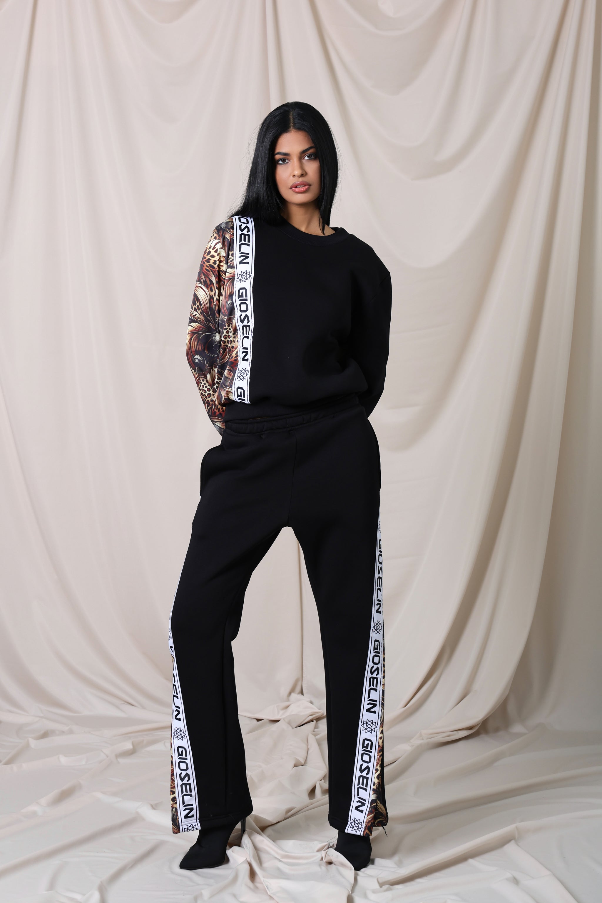 The sweatshirt features an elasticated hem and baroque/wild-themed satin inserts, adding a touch of sparkle and sophistication to the all-black look. The trousers , with an elasticated waist, feature an elegant flared cut that flatters the figure while maintaining the comfort typical of urban style.