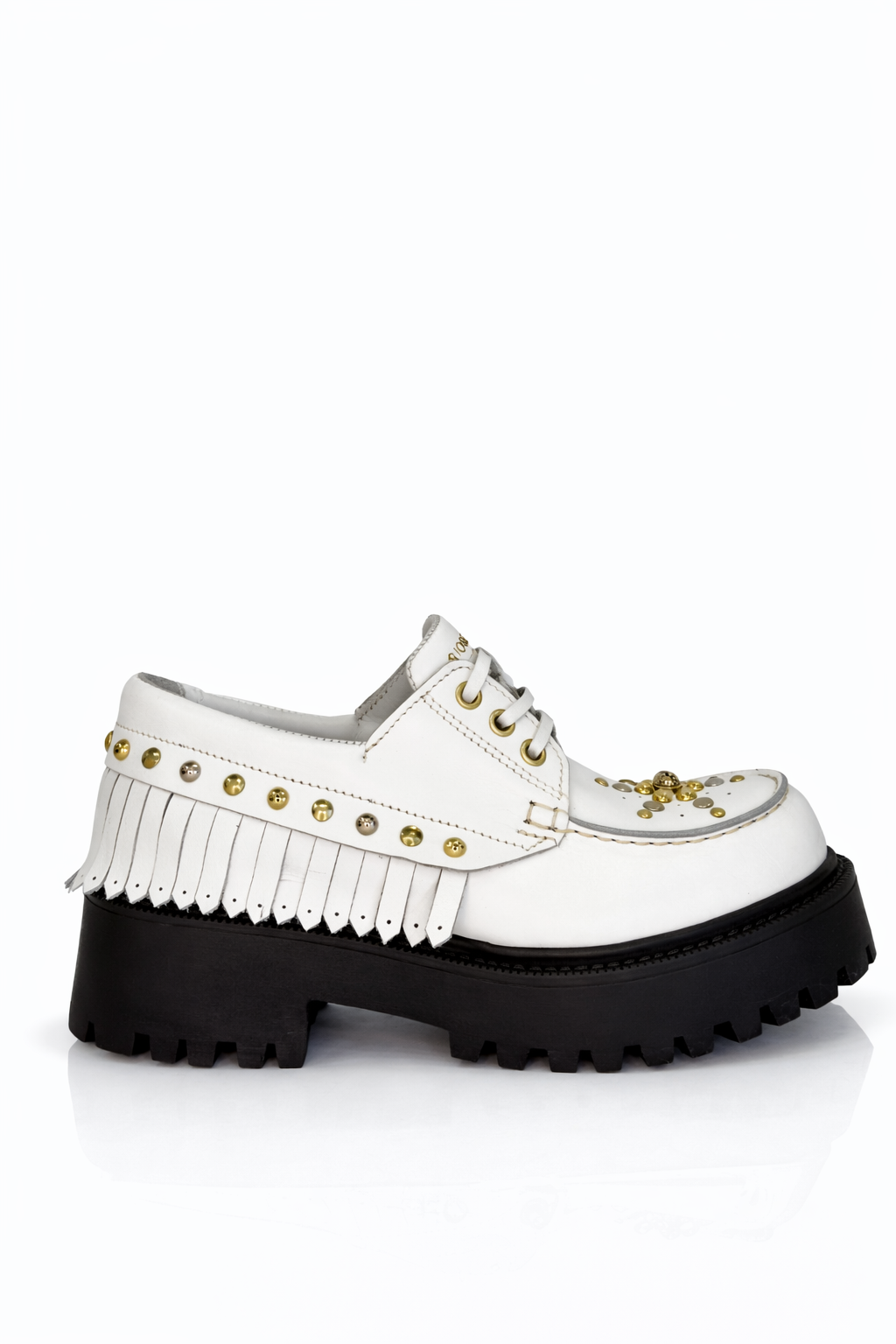 Platform moccasin with a sophisticated and contemporary style, crafted entirely from genuine leather and featuring decorative details that enhance the model's personality. The metallic appliques and side fringes add movement and uniqueness to the silhouette, creating the perfect balance between elegance and urban spirit.