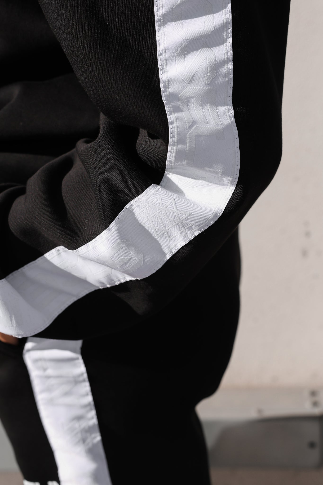 Tone-on-tone band applied along the sleeves and on the sides of the trousers