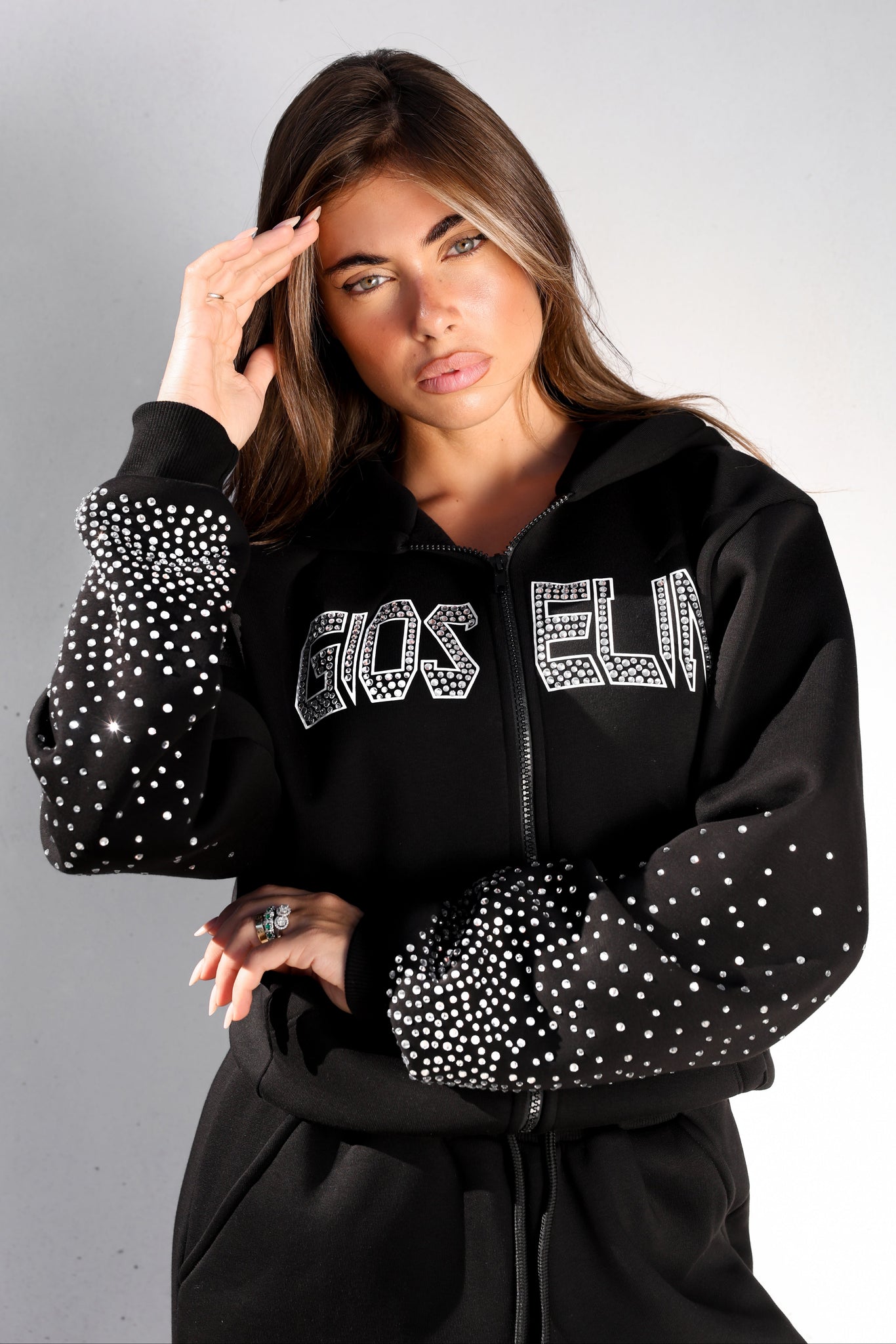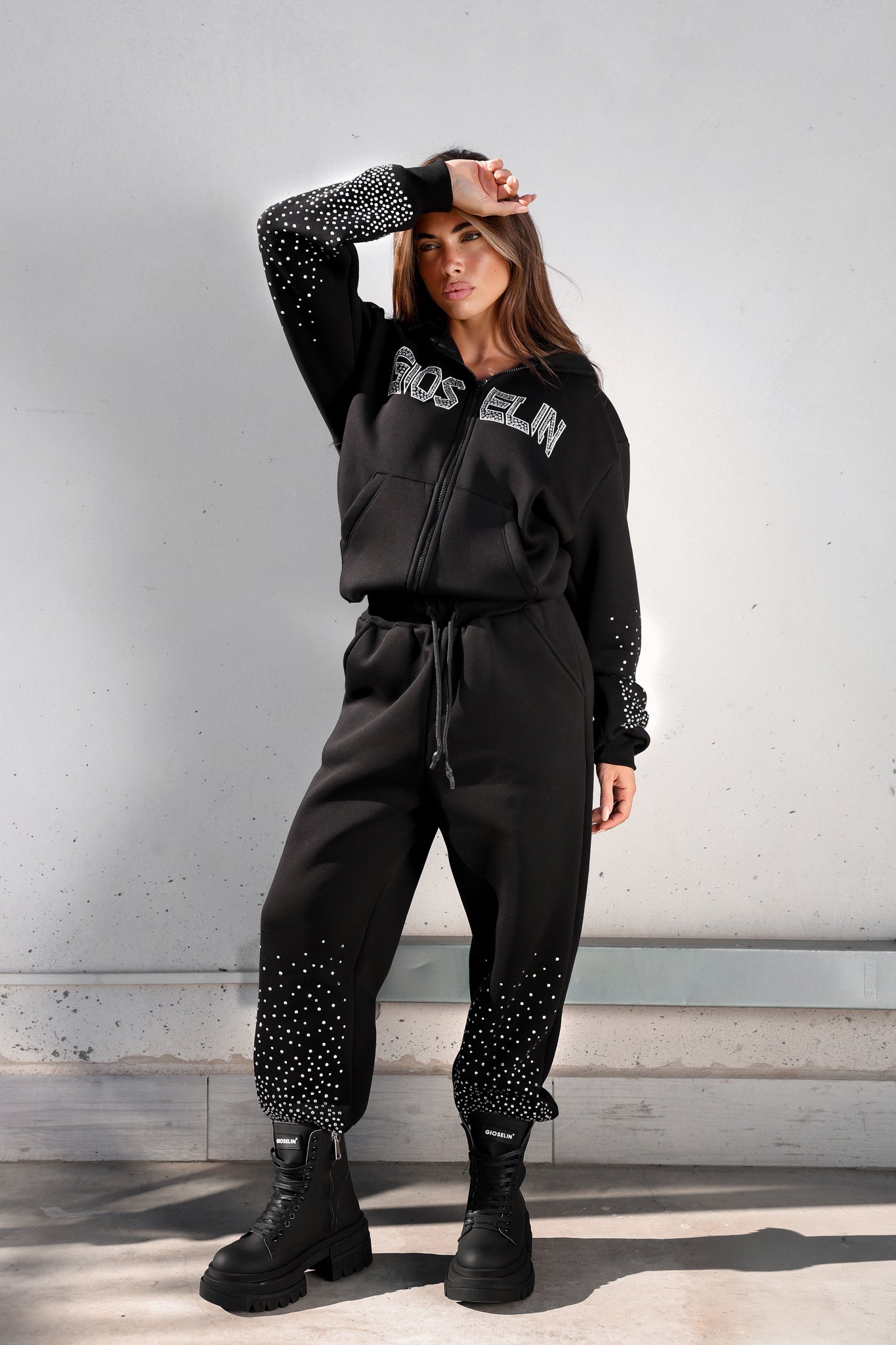 The design is embellished with the diamond-effect GIOSELIN lettering applied to the sweatshirt, combined with a veritable shower of glitter that illuminates the sleeves and the bottom of the trousers, creating an elegant and modern play of light.