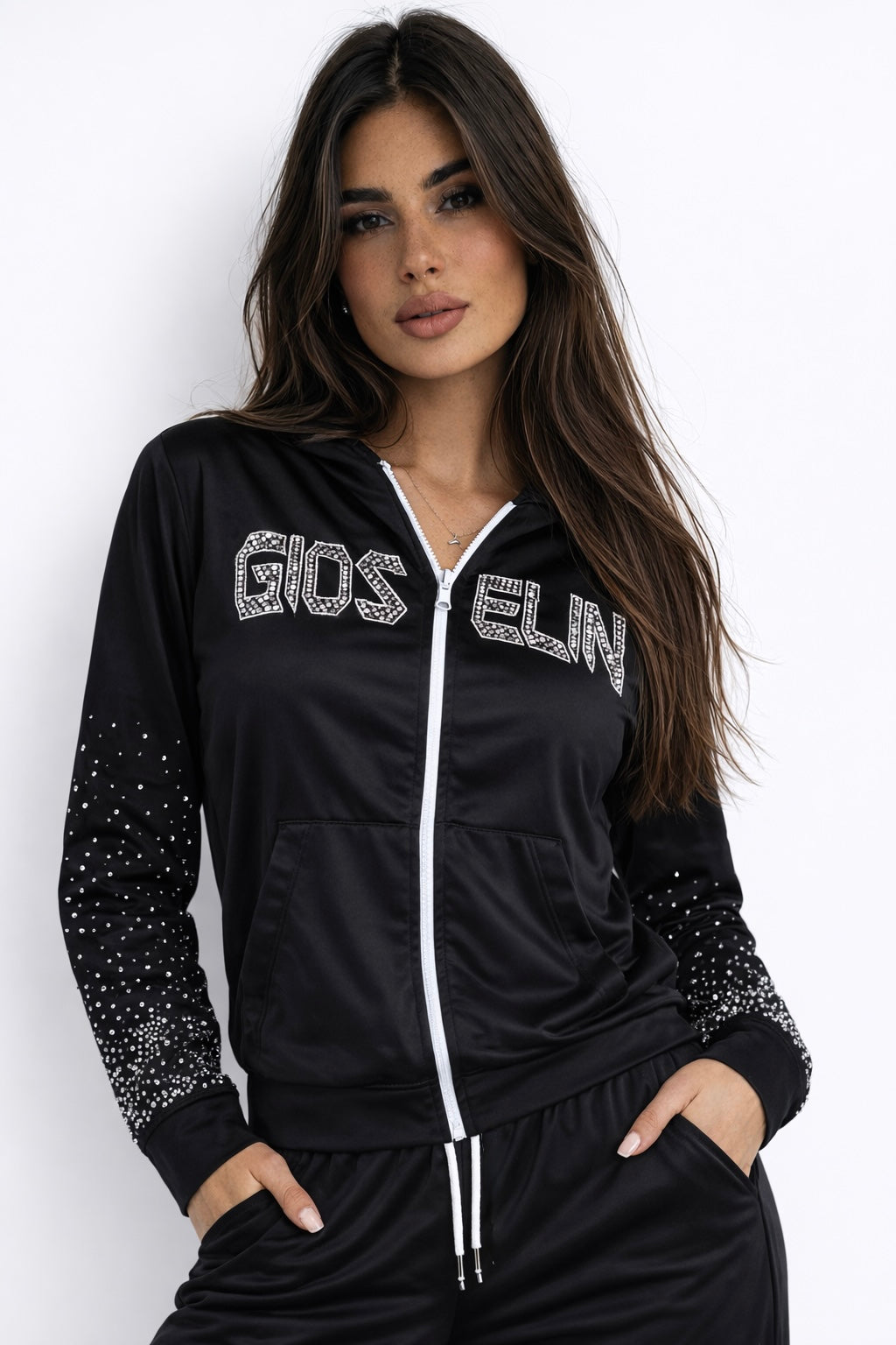 The key detail is the Gioselin logo embellished with Swarovski crystals , bright and refined, which gives character and instant recognition. The matching sparkles on the sleeves and bottom of the trousers add an elegant yet bold glamorous effect.