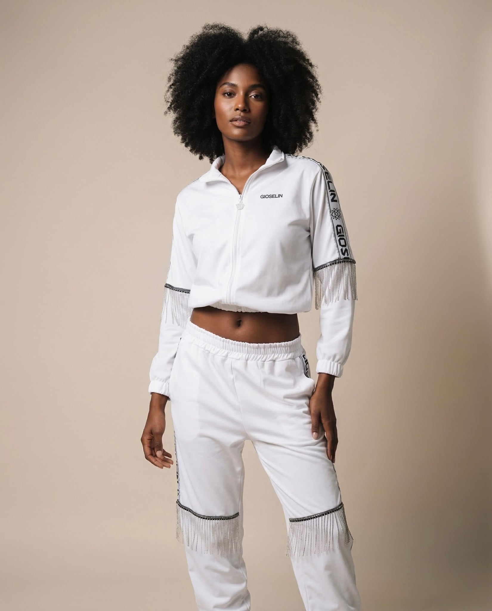 The key detail is the bright fringes applied to the sleeves and trousers , creating a dynamic effect with every step. The side stripes with the Gioselin logo reinforce the brand's identity, while the clean design of the front zip lends balance and modernity.