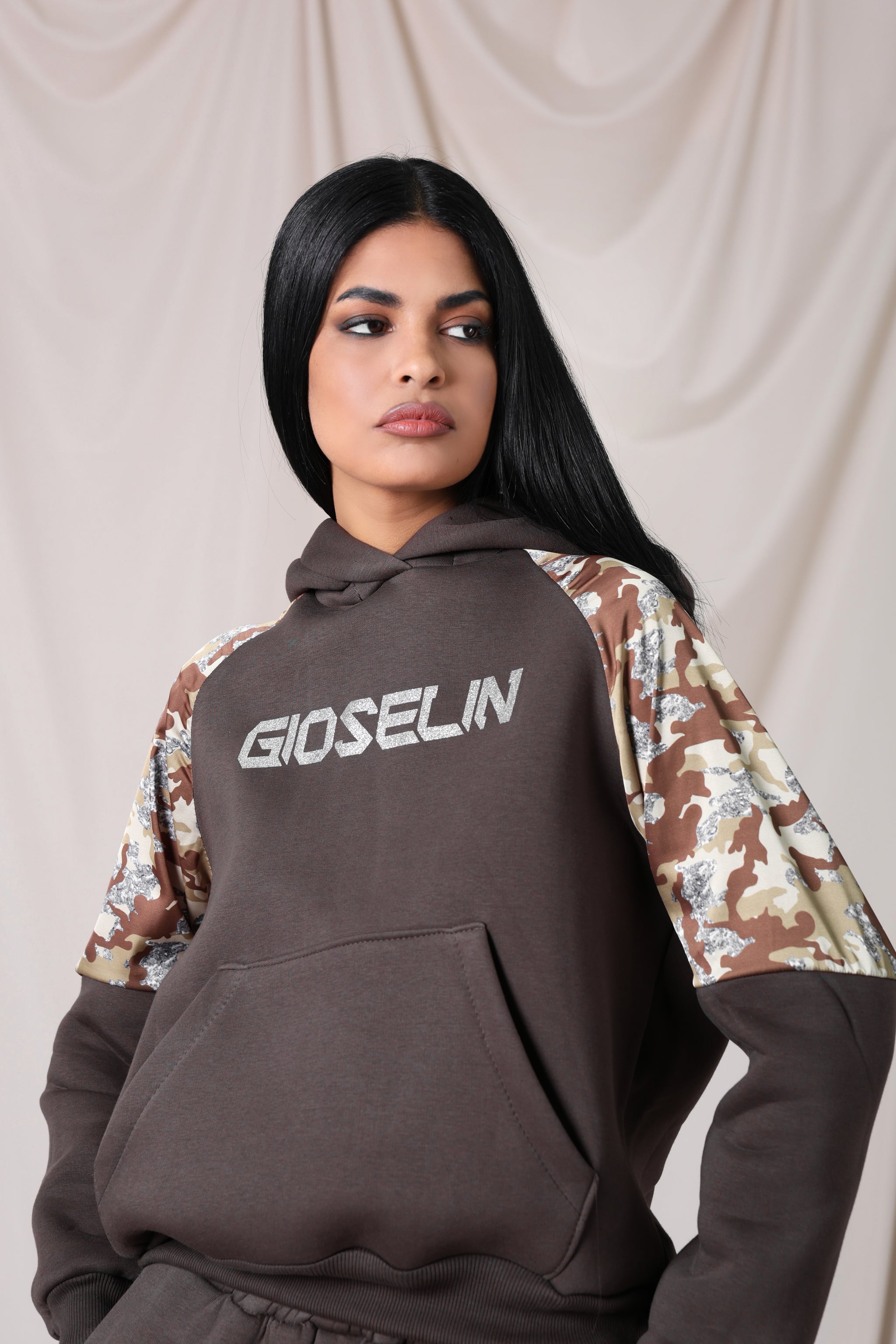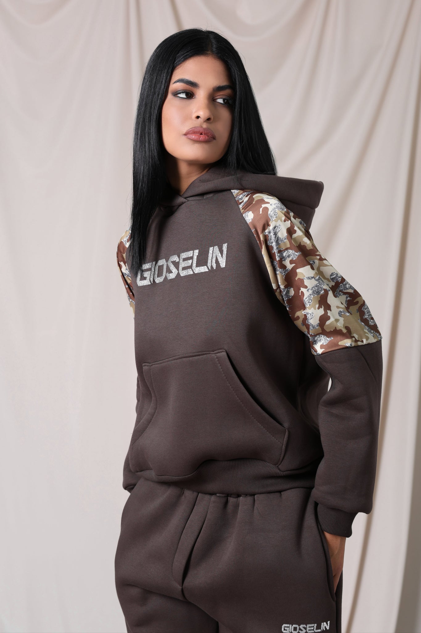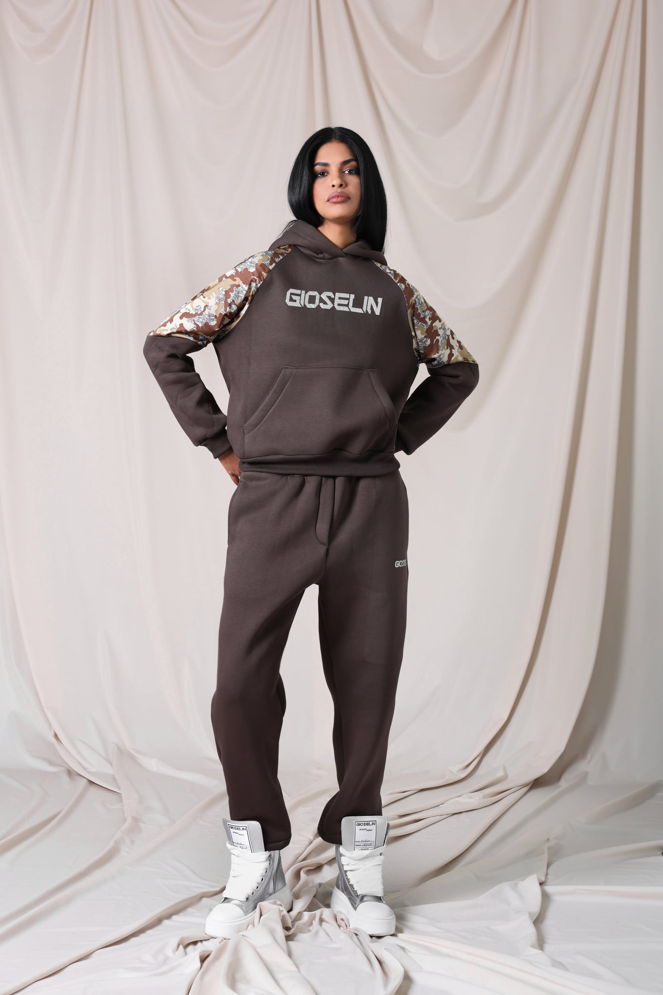 The Shine Camouflage Brown Tracksuit is part of the new Gioselin Winter Collection and is designed for those seeking urban style with a touch of glamor. Crafted from warm fabric with a plush interior, it's perfect for facing the winter with comfort and personality.