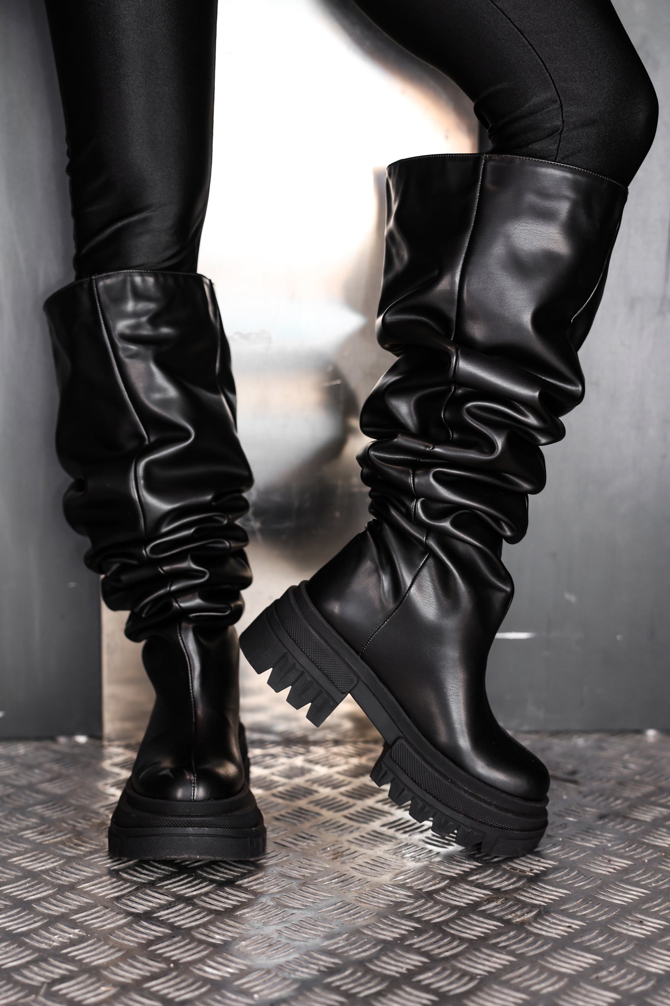Crafted from high-quality black leather, with a rounded toe and chunky, serrated sole, this high-heeled boot combines comfort and bold style in a single piece. The slouchy fit of the upper makes this boot the star of any outfit, perfect for those seeking a shoe that's more than just a detail, but the focal point of their look.