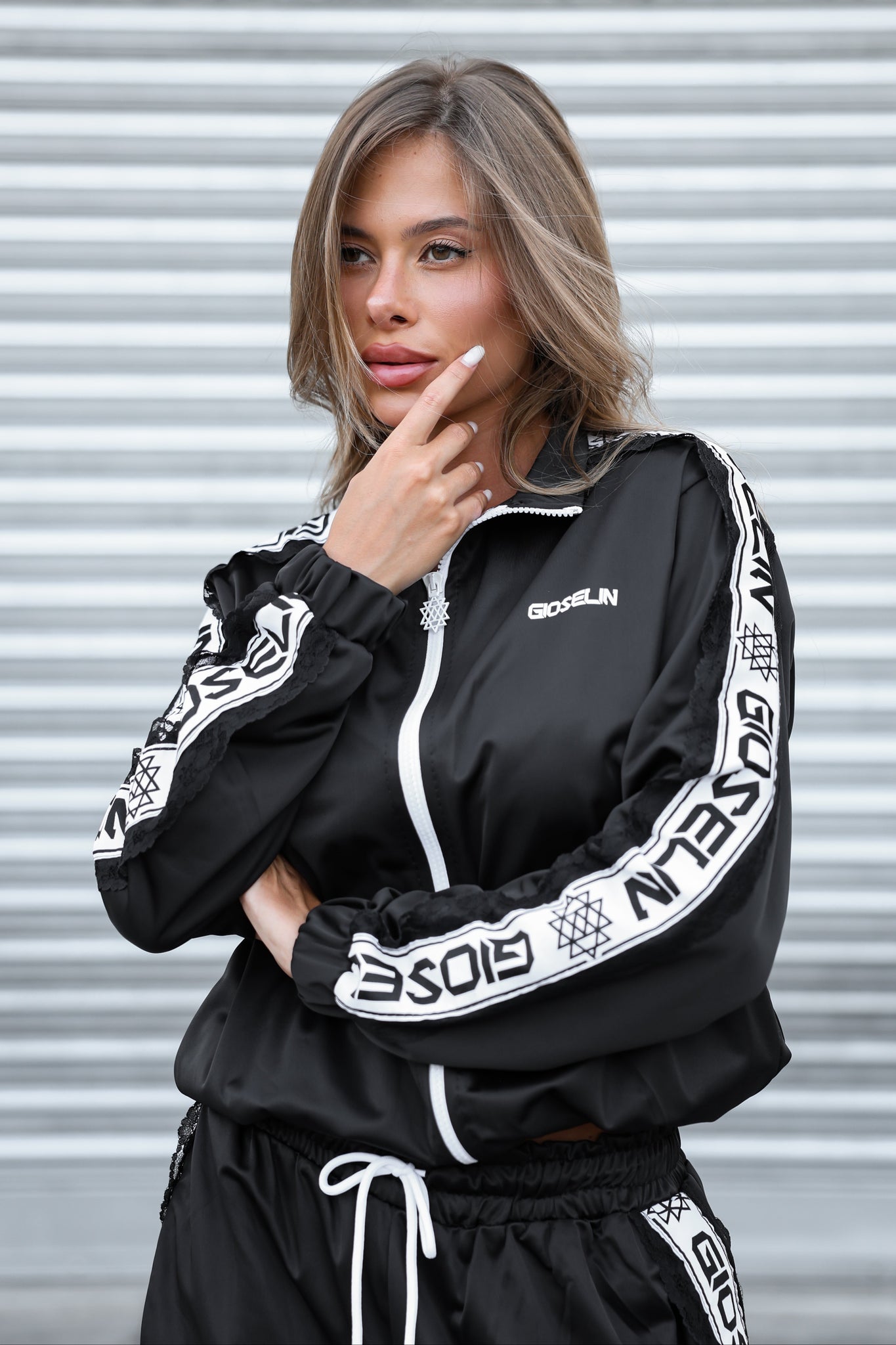 Crafted from soft, snug, and shiny technical acetate , this jumpsuit—sold as a matching set —consists of a zip-up jacket and trousers with an adjustable waist. But what makes it unique is the enchanting detail: refined, lacy lace embroidery along the sleeves and side panels of the trousers. An elegant and sophisticated touch that contrasts with the powerful, maxi-print Gioselin logo.