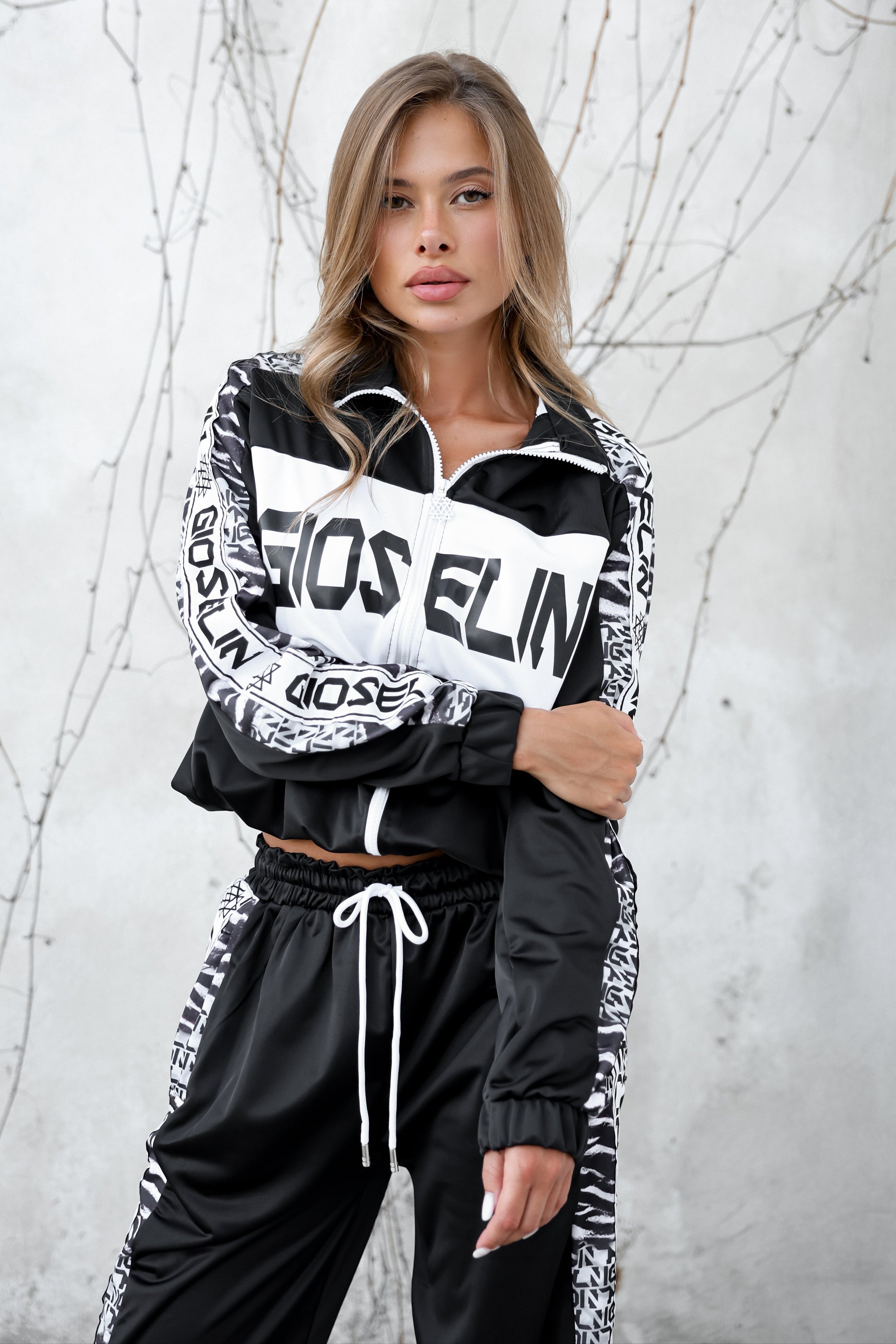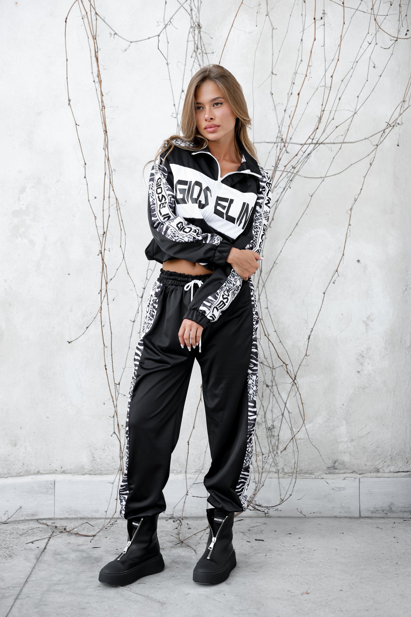 Crafted from technical acetate , it features a zip-up jacket and trousers with adjustable drawstrings, sold together for a total look that commands presence. The side and sleeve bands are embellished with a two-tone zebra print, interrupted only by the bold GIOSELIN logo in optical white, which dominates the chest and edges. A visual balance that combines graphic precision and indomitable spirit.