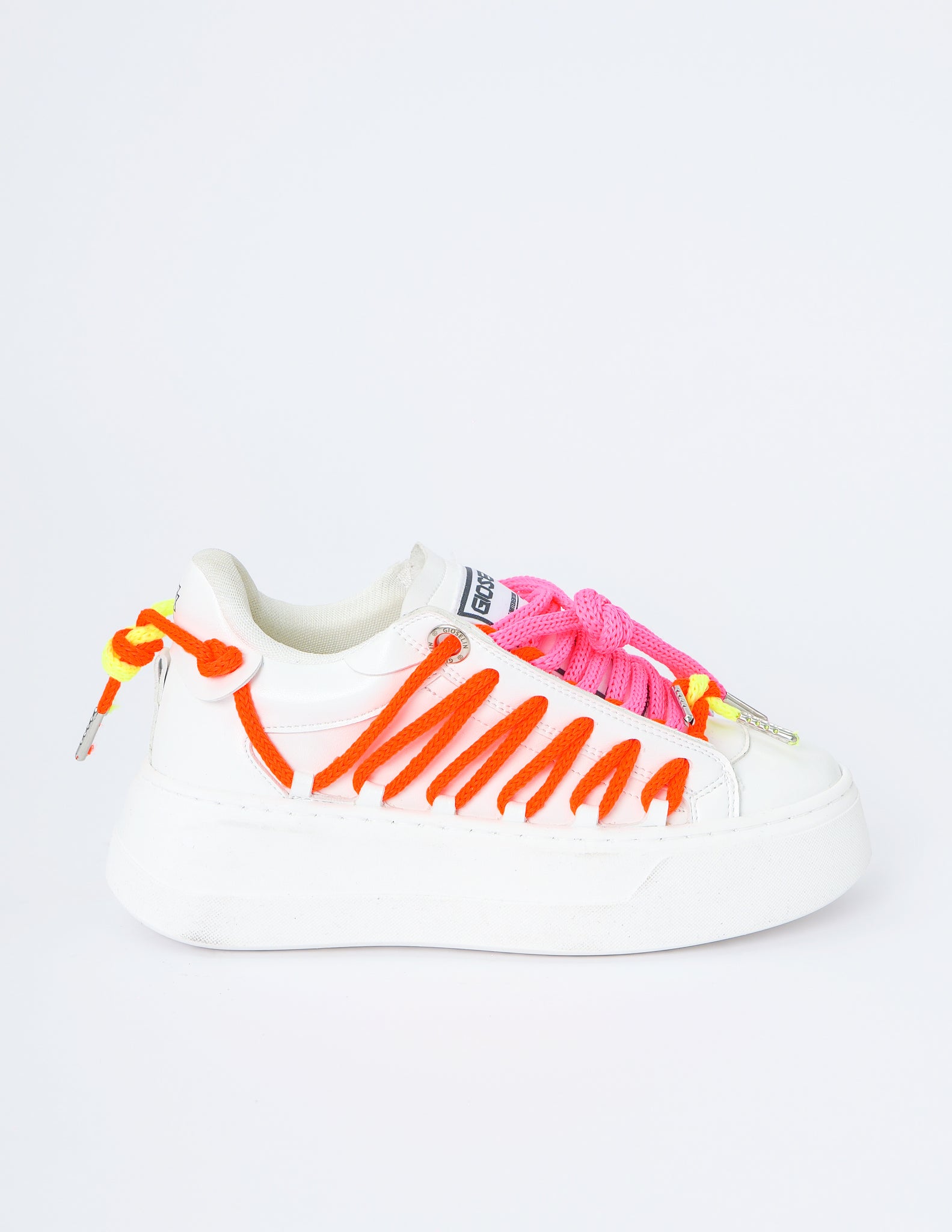 The white synthetic leather base lights up thanks to the unmistakable detail of the oversized multicolored laces : fuchsia, neon orange, fluorescent yellow and lime green alternate in a chromatic symphony that does not go unnoticed.