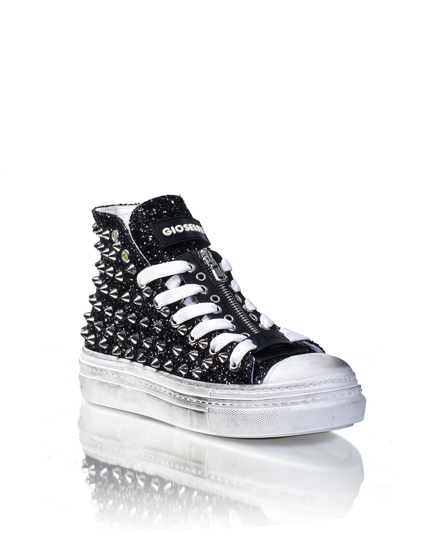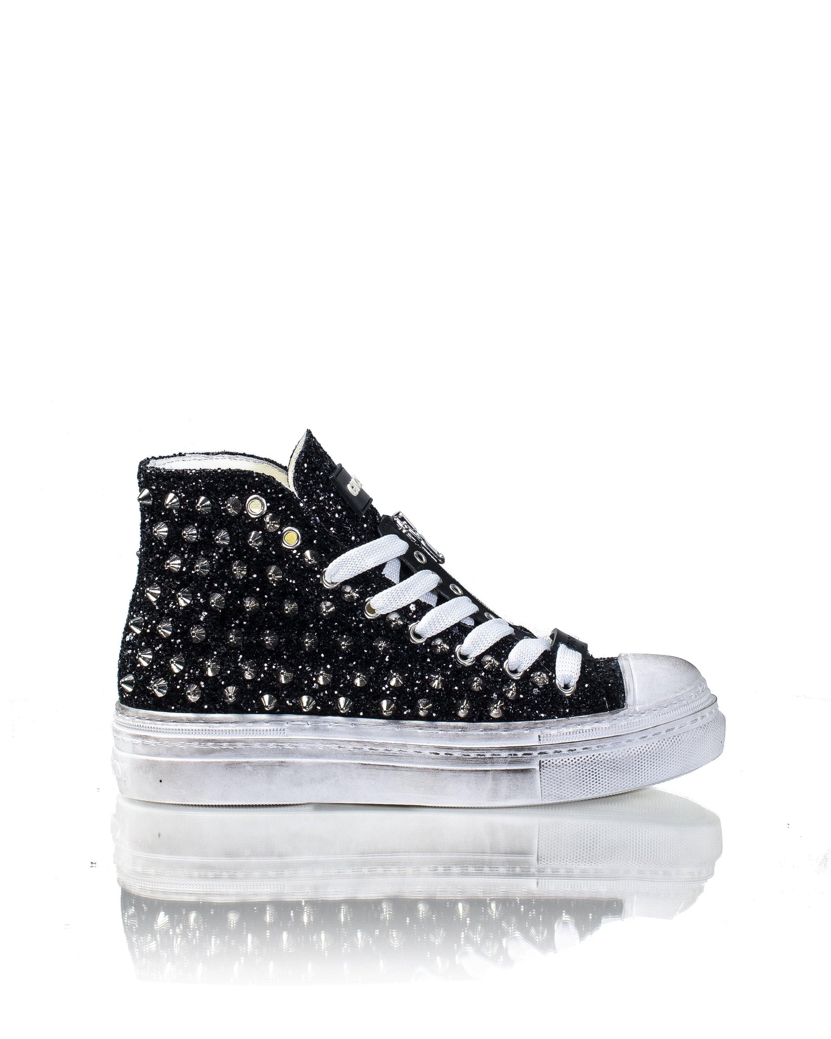 If you want a unique and bold style that will catch the eye in every situation, the Black Glitter Studded Sneakers are the ideal choice. With these sneakers, you can never go wrong, because a touch of sparkle and a pinch of originality can make the difference in your wardrobe.
