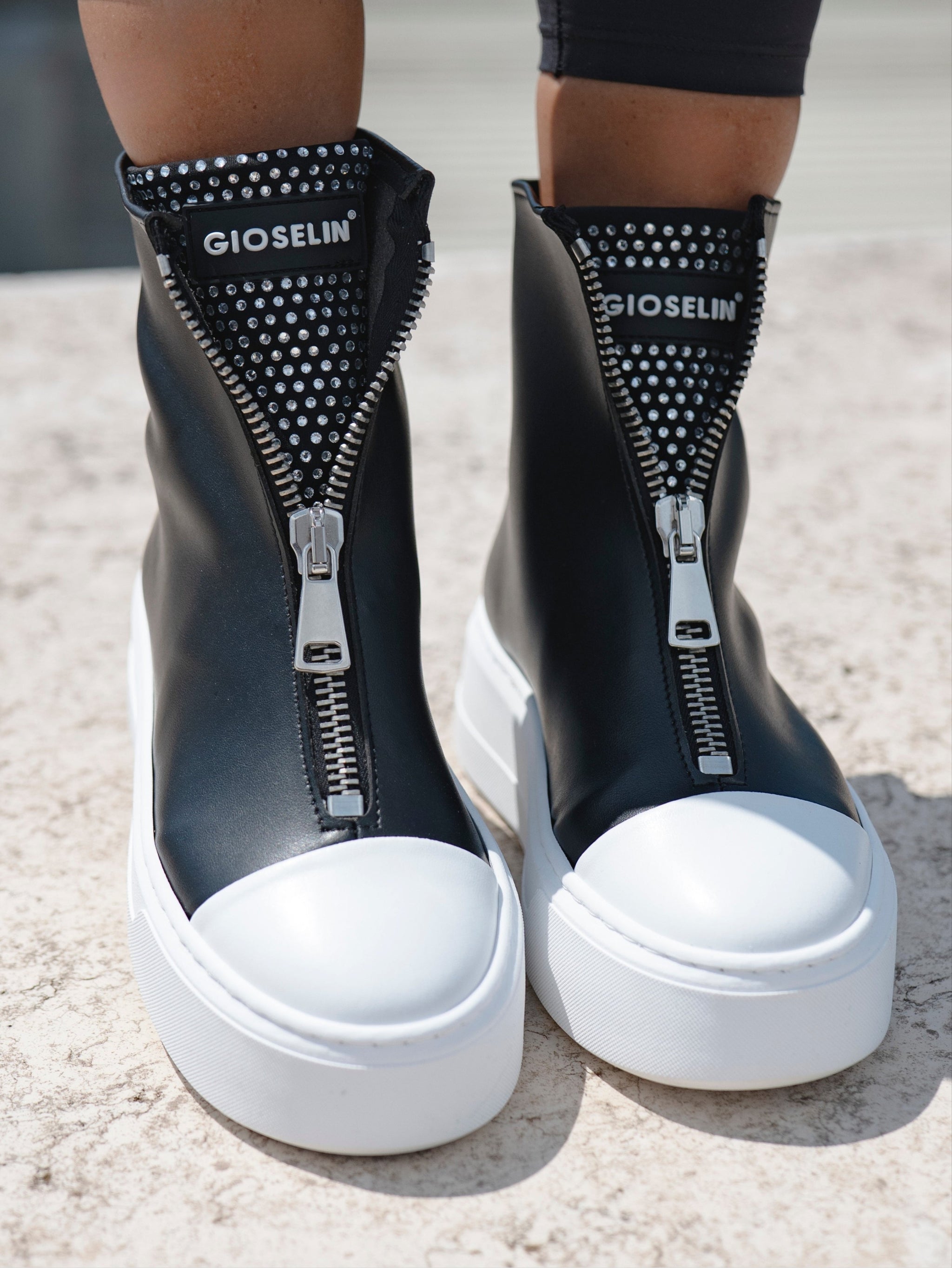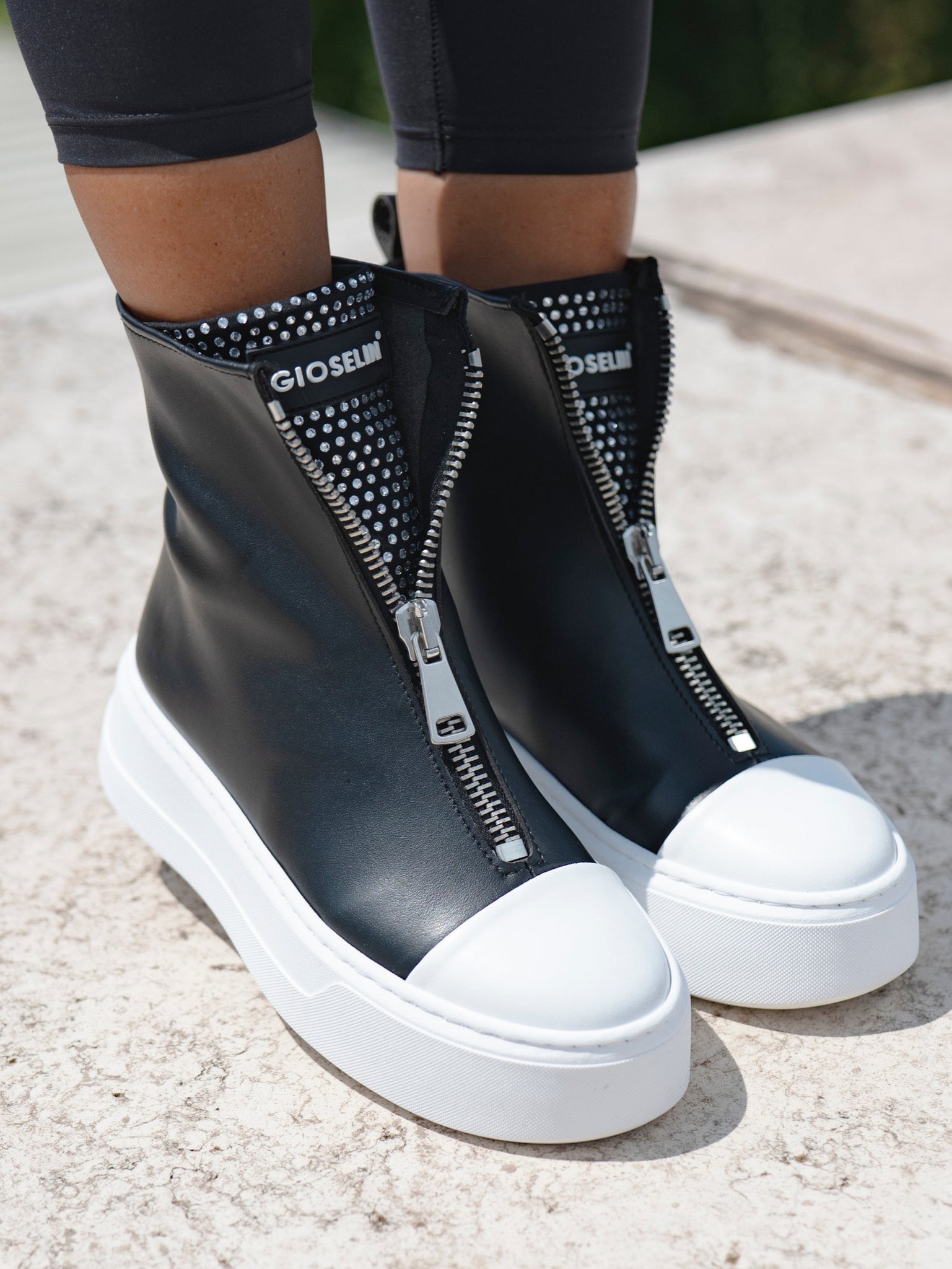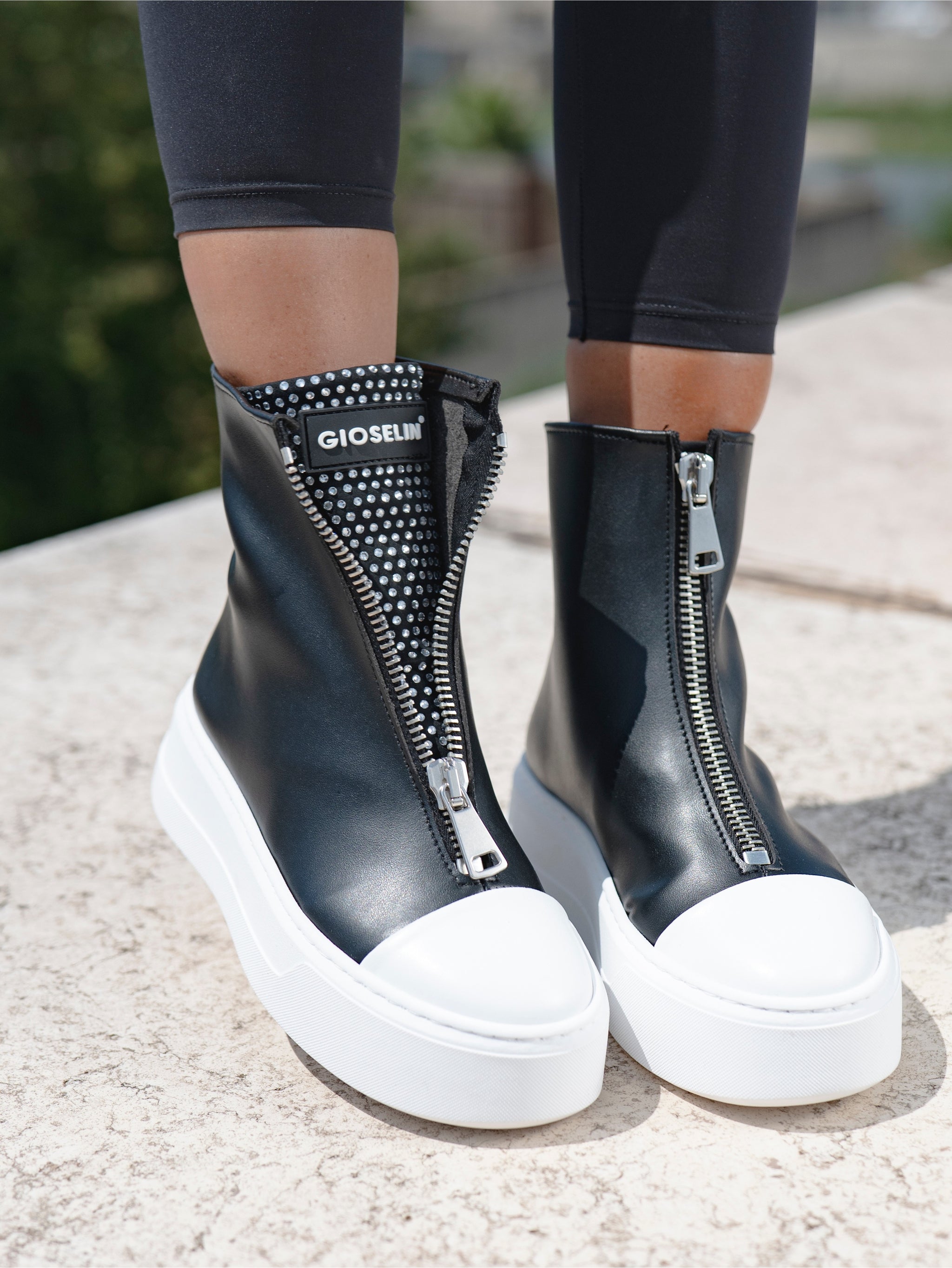 The matte black upper elegantly contrasts with the white toe and sole, creating a clean, modern look. The fully opening double front zip reveals the jeweled sock, transforming the shoe into a statement accessory perfect for day or evening looks.