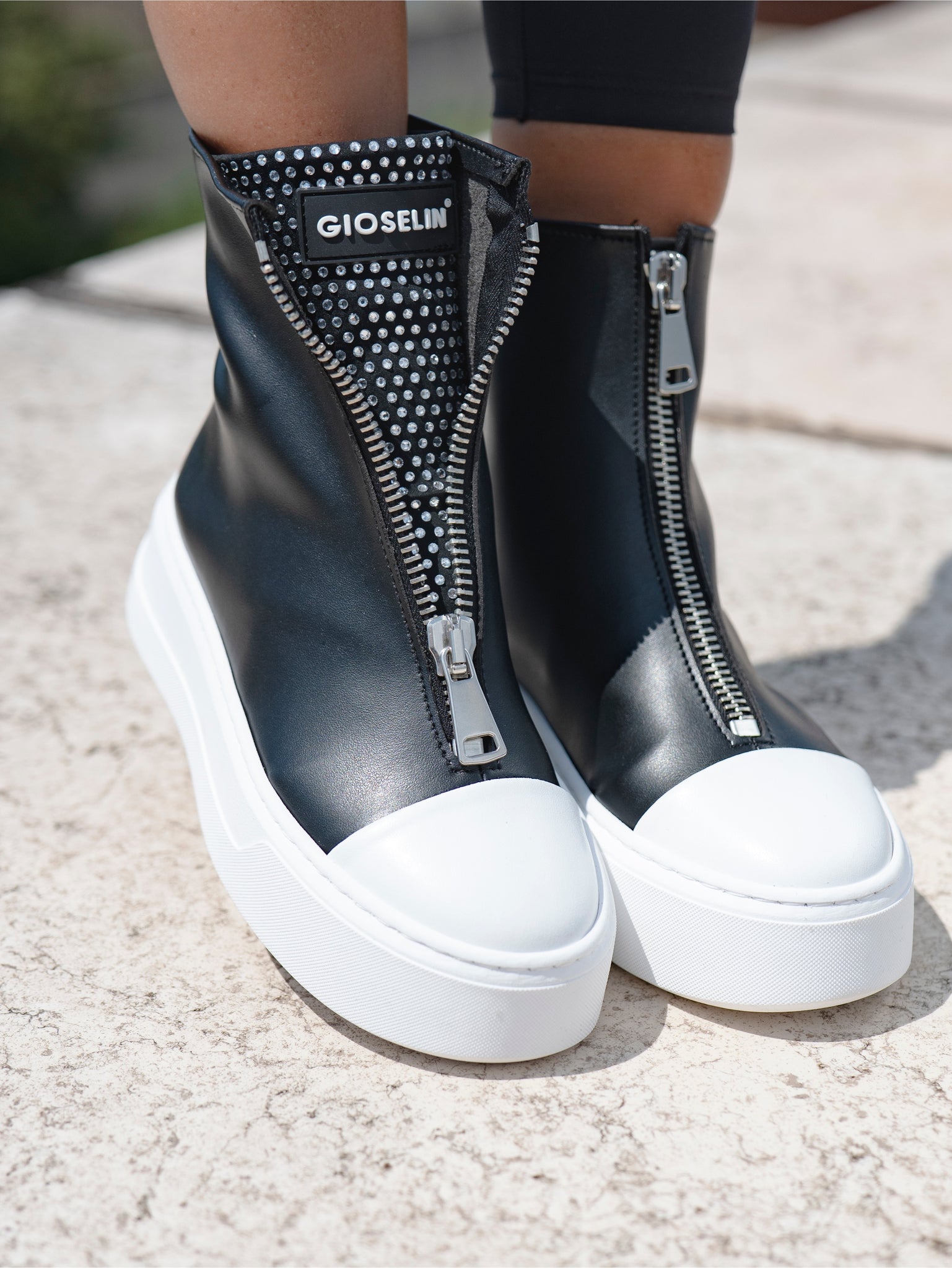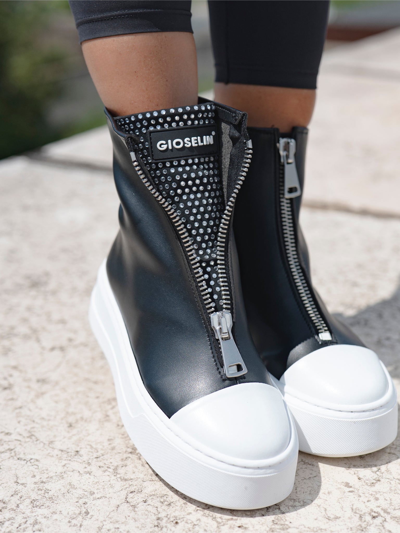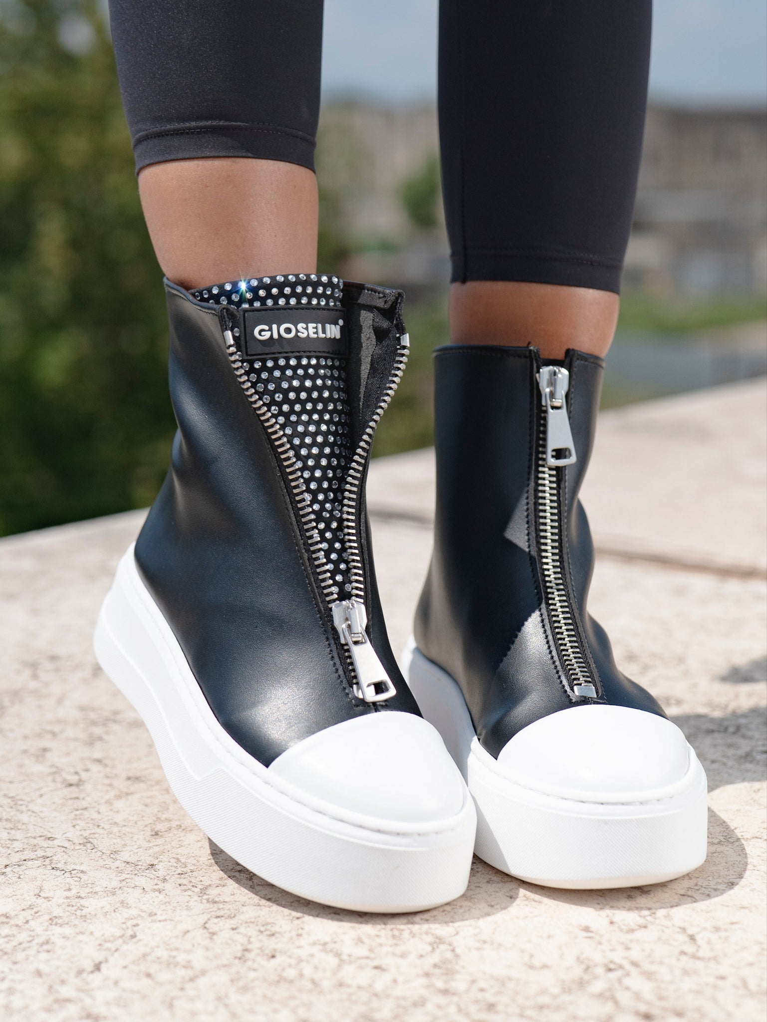 The matte black upper elegantly contrasts with the white toe and sole, creating a clean, modern look. The fully opening double front zip reveals the jeweled sock, transforming the shoe into a statement accessory perfect for day or evening looks.
