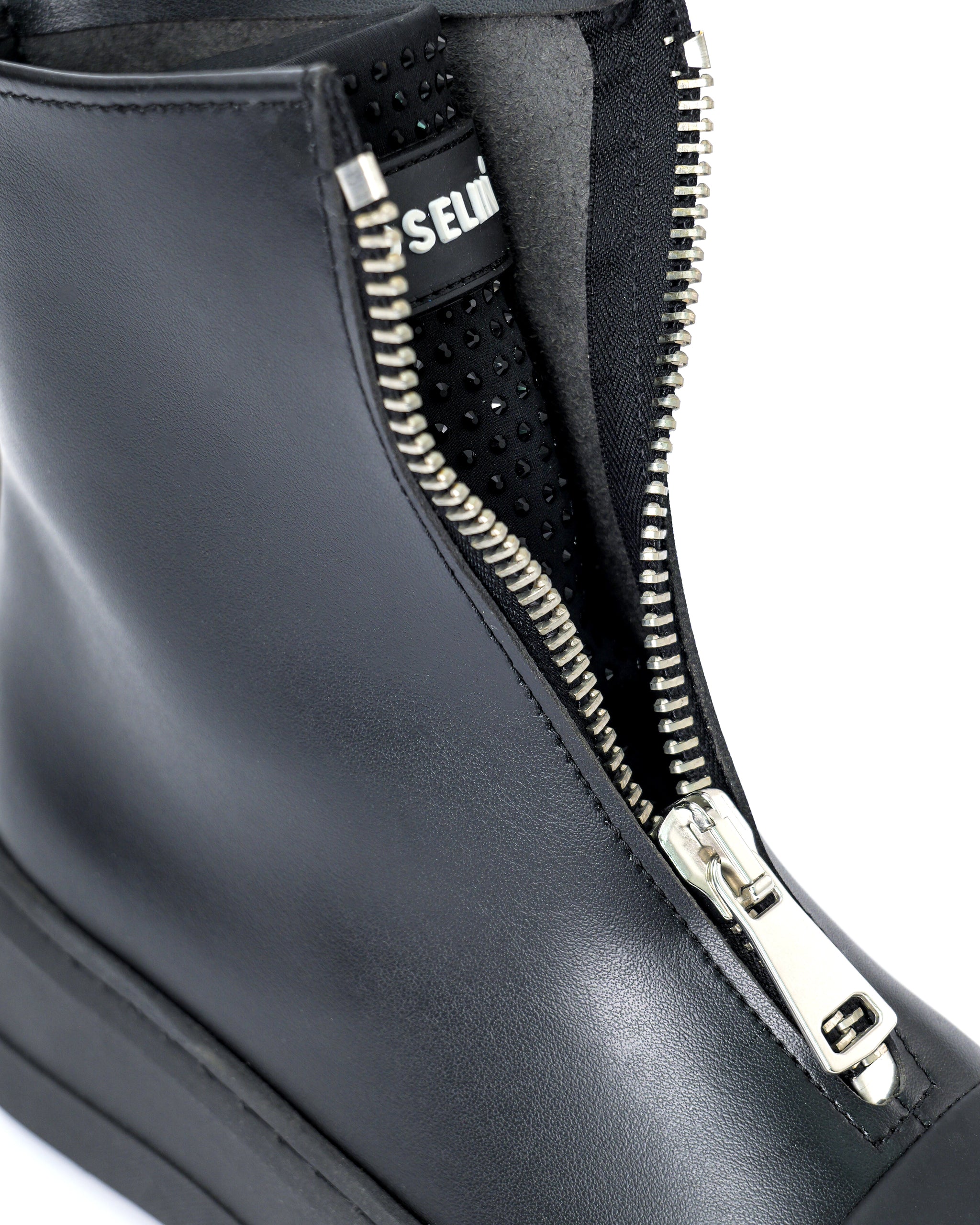 Minimalist, yet never banal. The LIGHT LINE Total Black Diamond model is the epitome of strong, refined femininity, perfect for those who love to stand out with discretion. Completely black from sole to toe, this ankle boot is highlighted by the inner sock embellished with tone-on-tone micro Swarovski crystals: a precious detail that shines with class, without ever being over the top.