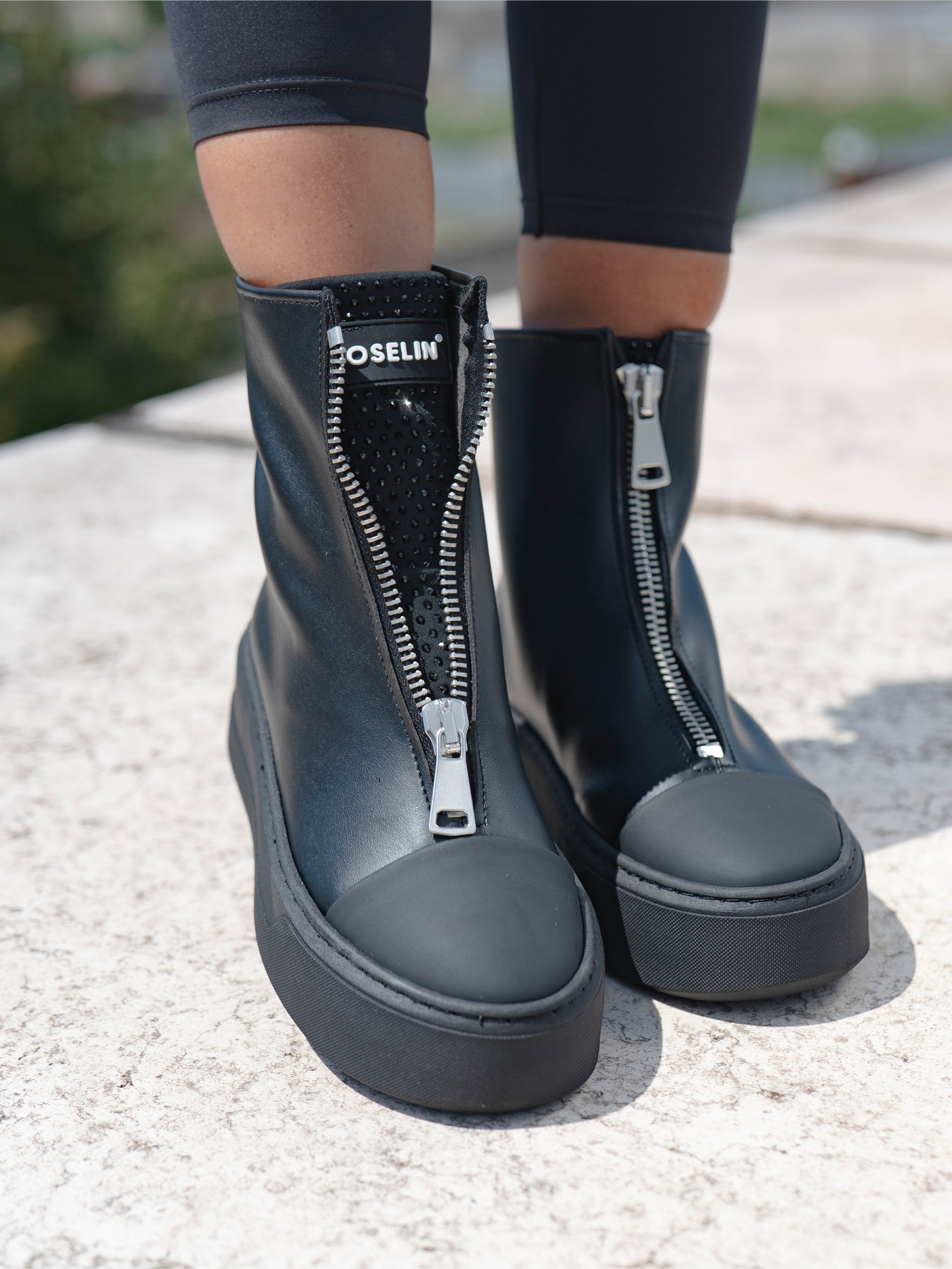 The double front zip allows a glimpse of the glittery interior, adding a touch of fashion to even the most basic look. Gioselin's signature comfort remains the key feature, with a sock-like fit that hugs the foot, while the platform sole (5.5 cm at the heel and 4 cm at the forefoot) and 14 cm shaft ensure momentum and stability.