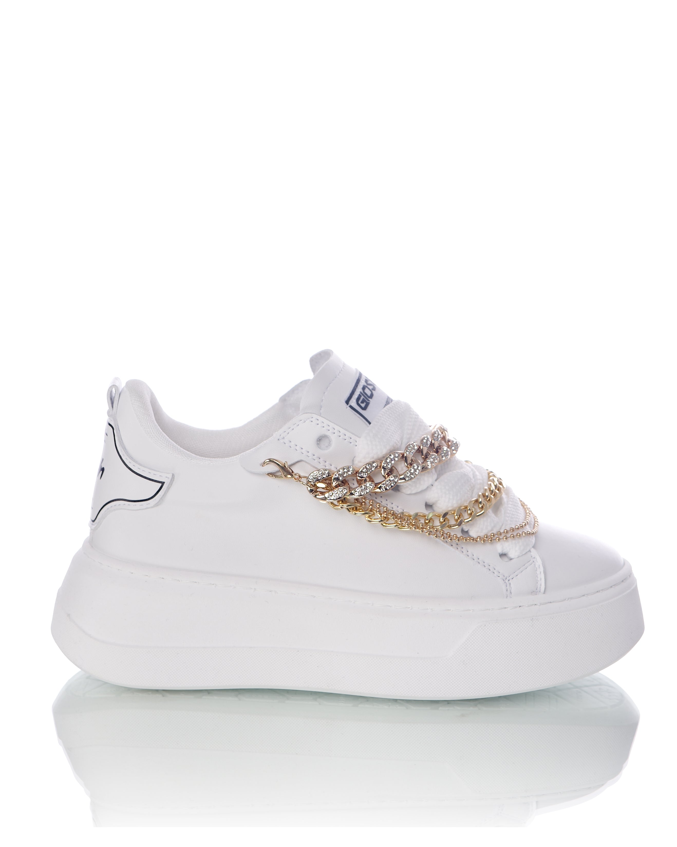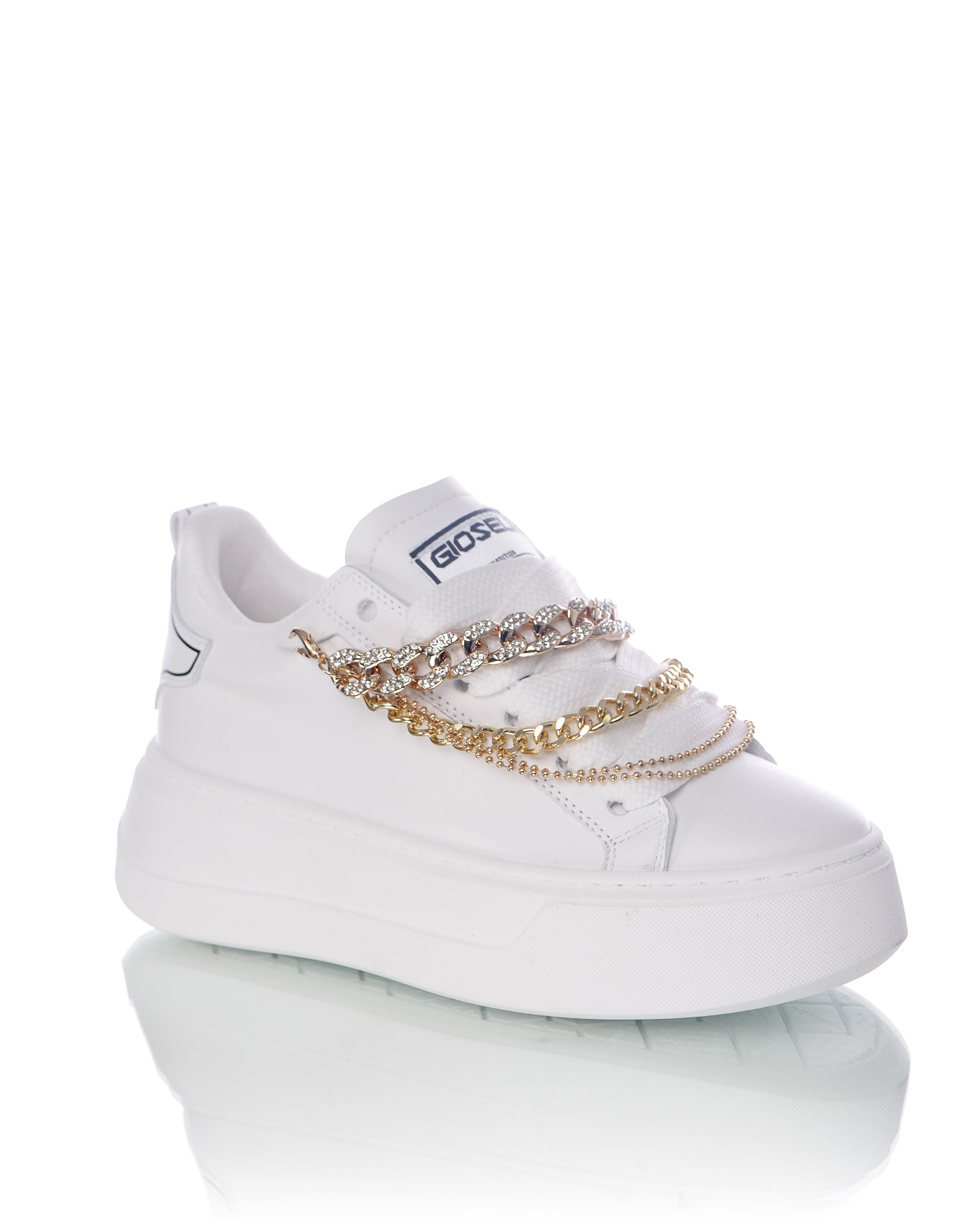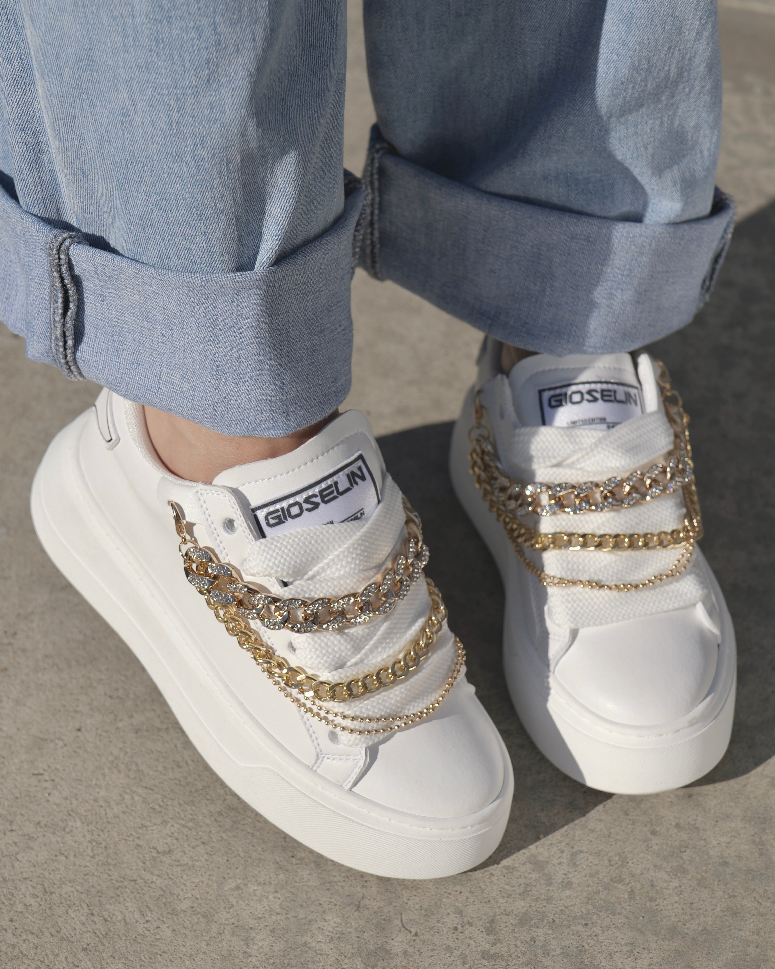 Gioselin's Collier model is a true statement of style, where elegance meets modernity in a sneaker with an exclusive and distinctive design. The clean white base of this shoe leaves room for the most surprising element: a precious removable chain, inspired by the timeless charm of collier necklaces. Carefully crafted, the chain features a combination of golden links and sparkling crystals that rest on the upper in a refined interweaving of light and movement, transforming the shoe into a jewel to be worn.