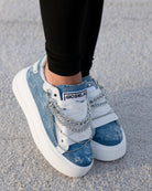 A perfect mix between elegance and streetwear. Collier Denim Argento is the sneaker that redefines the concept of versatility and style. Made of real jeans , this shoe stands out for its modern design and exclusive detail: a removable silver chain necklace , which adds a touch of light and character to your look.