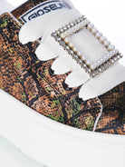 The Pearl Pitonato is much more than a simple shoe, it is a real jewel. Between the laces, a buckle decorated with pearls and rhinestones immediately catches the eye, giving a touch of inimitable luxury. At the heel, a removable accessory of pearls and rhinestones completes the refined aesthetic, adding an element of glamour to your every step. This feature allows you to customize the shoe according to your style and the occasion.