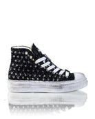 If you want a unique and bold style that will catch the eye in every situation, the Black Glitter Studded Sneakers are the ideal choice. With these sneakers, you can never go wrong, because a touch of sparkle and a pinch of originality can make the difference in your wardrobe.