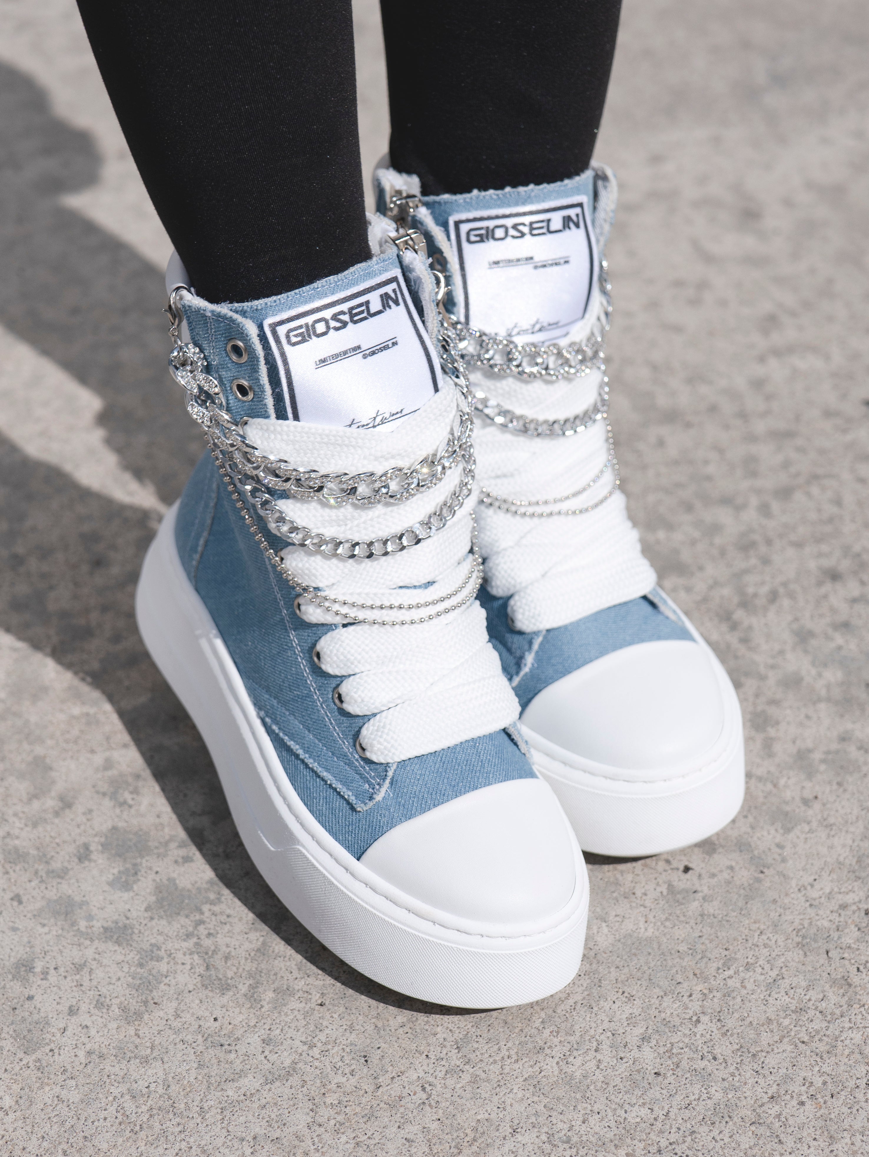 Made of fine denim, a material that symbolizes freedom and personality, the model is embellished with the unmistakable removable necklace-effect accessory : a golden chain with bright crystals that wraps around the leg and gives a touch of luxury in full Gioselin style. A detail that transforms the boot from streetwear to a true fashion statement.