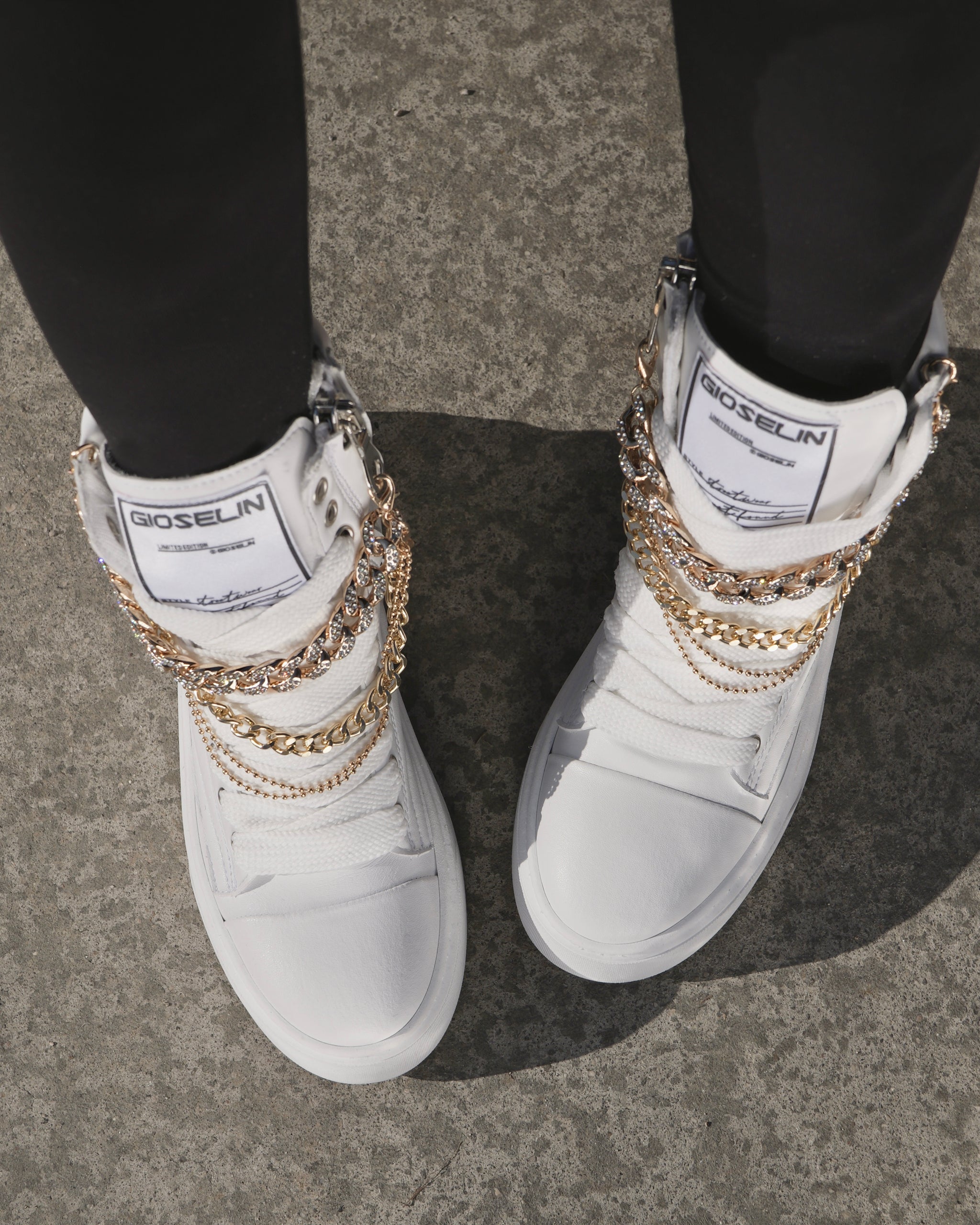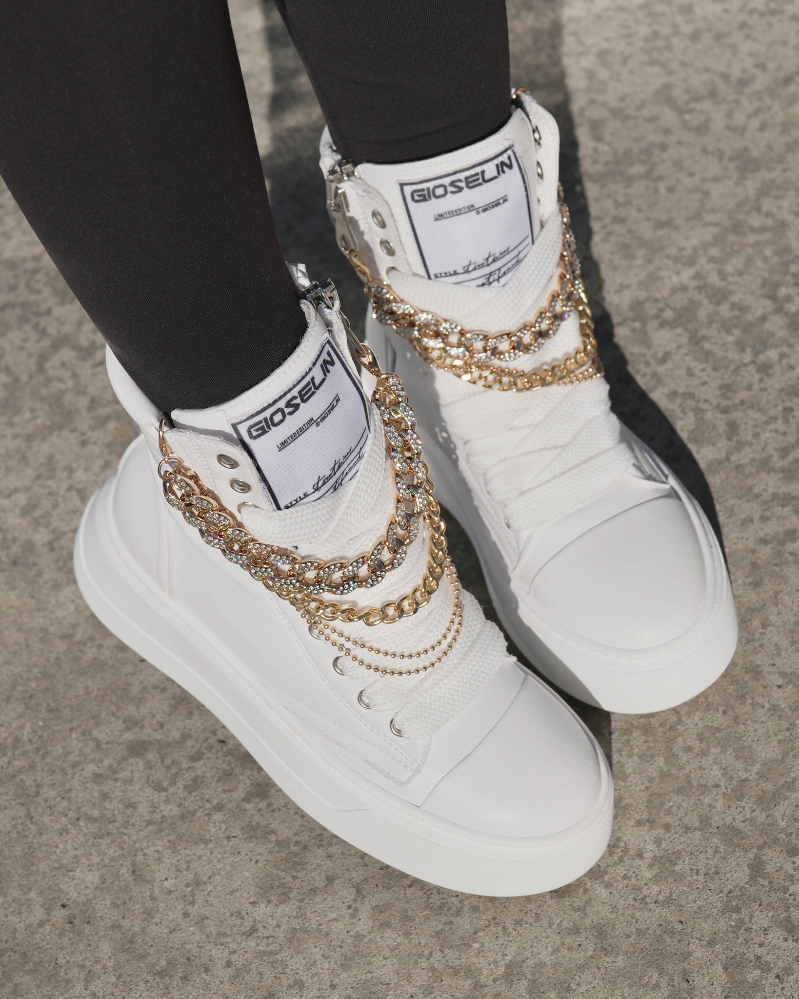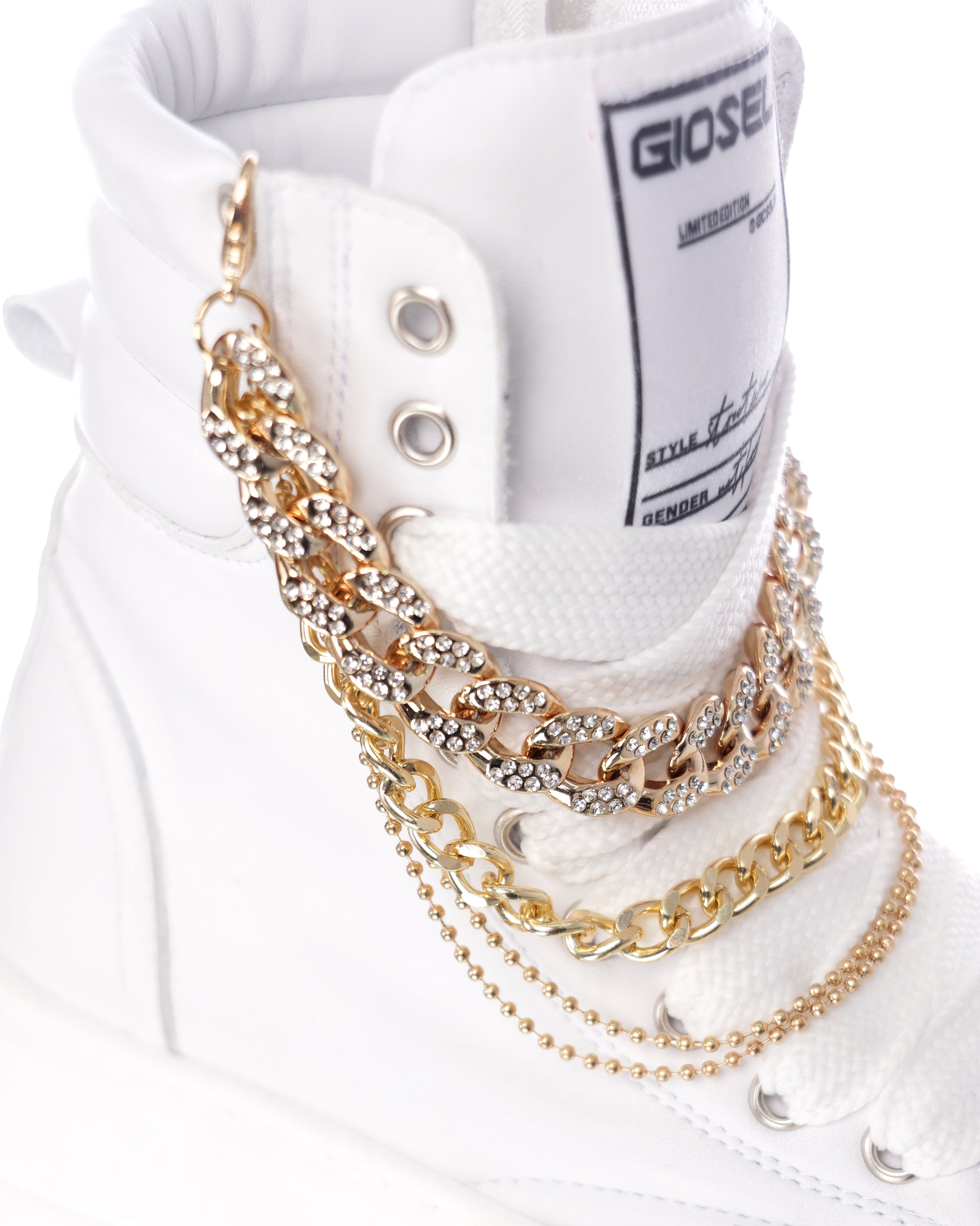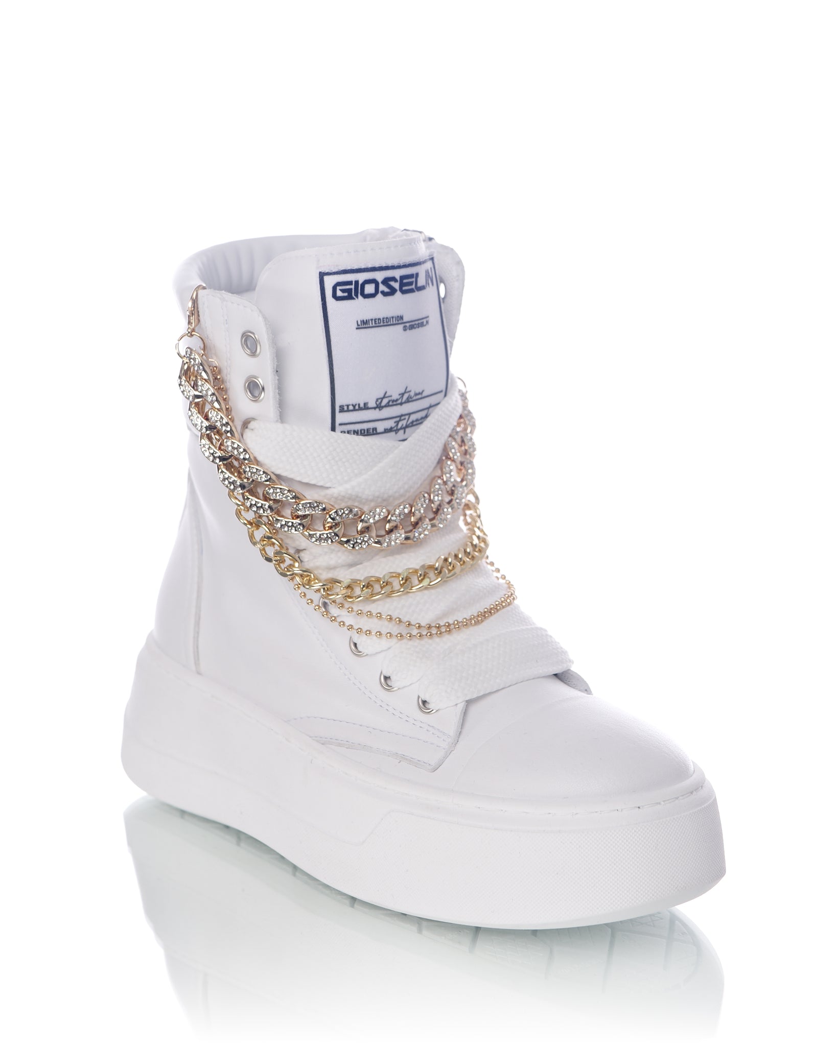 The Nit-Up Collier model by Gioselin is much more than a simple boot: it is a contemporary work of art that celebrates urban elegance with a touch of luxury. Crafted in a sophisticated total white, this high boot is designed for those who love to stand out through unique and refined details. The real protagonist is the removable accessory that recalls the elegance of a collier necklace. The golden chain, enriched with sparkling crystals, wraps around the shaft creating a visual contrast that enhances the glamorous character of this shoe.