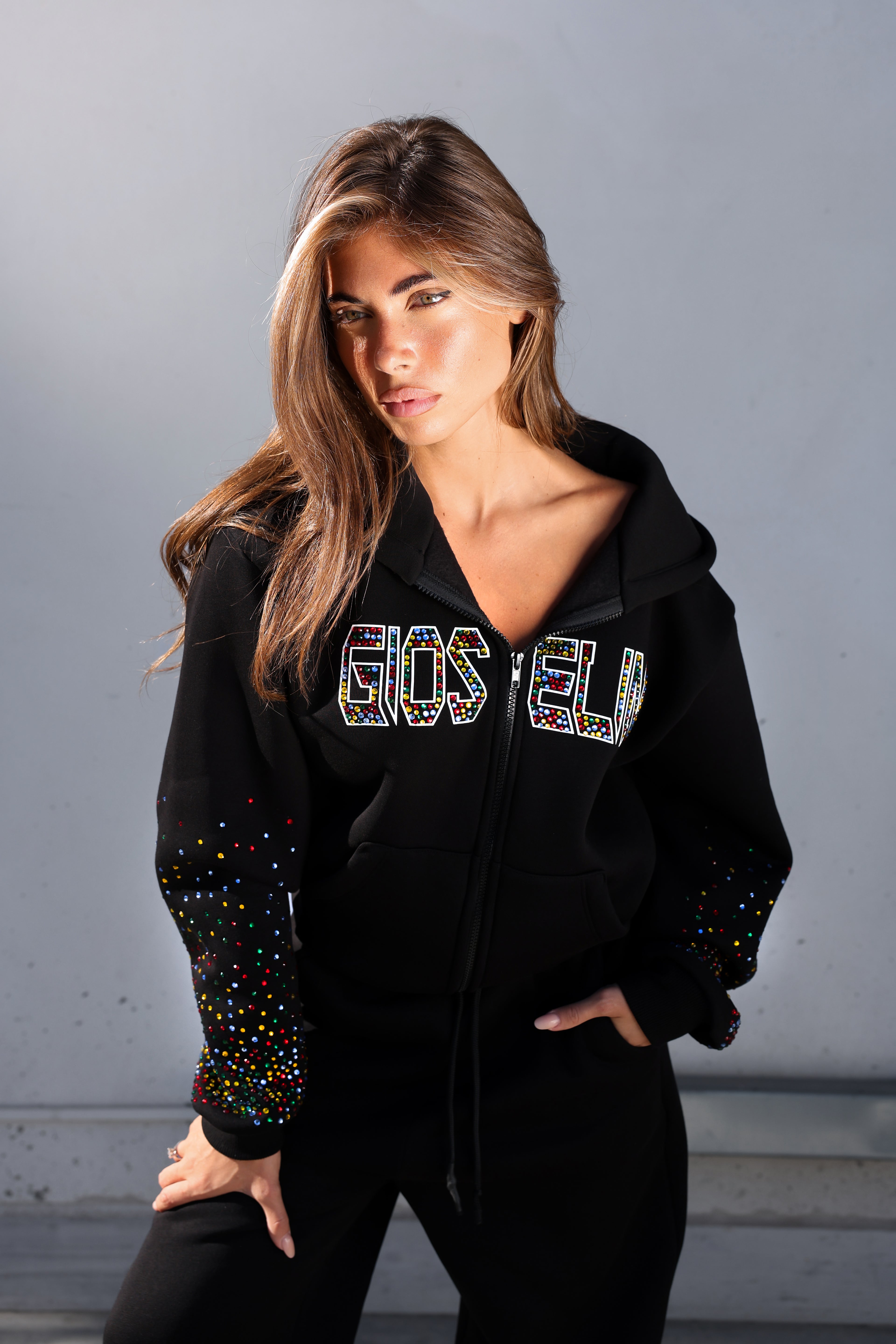 Its strong point is the multicolor diamond-effect GIOSELIN writing , an explosion of light and colors that illuminates the sweatshirt and makes every look unique.