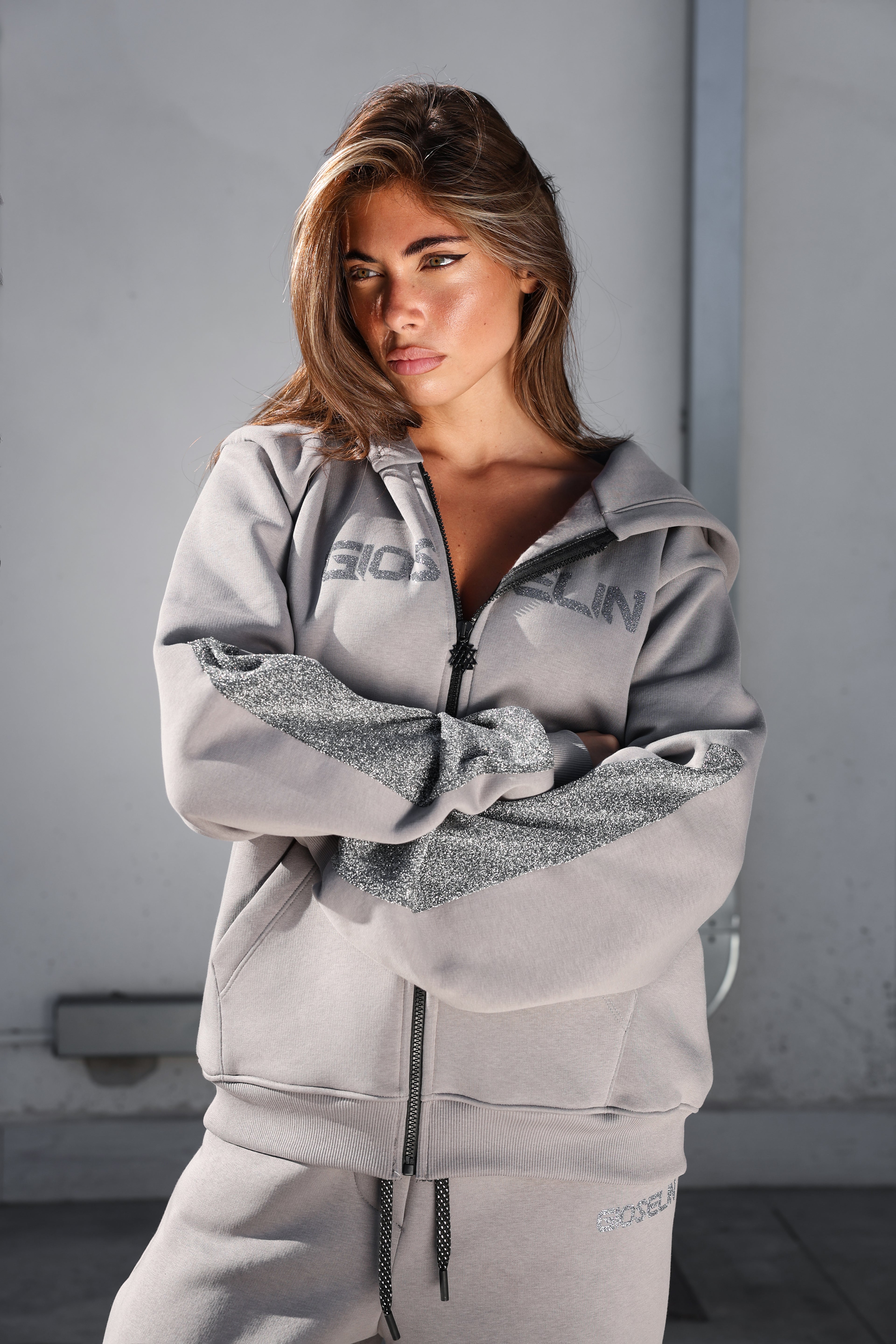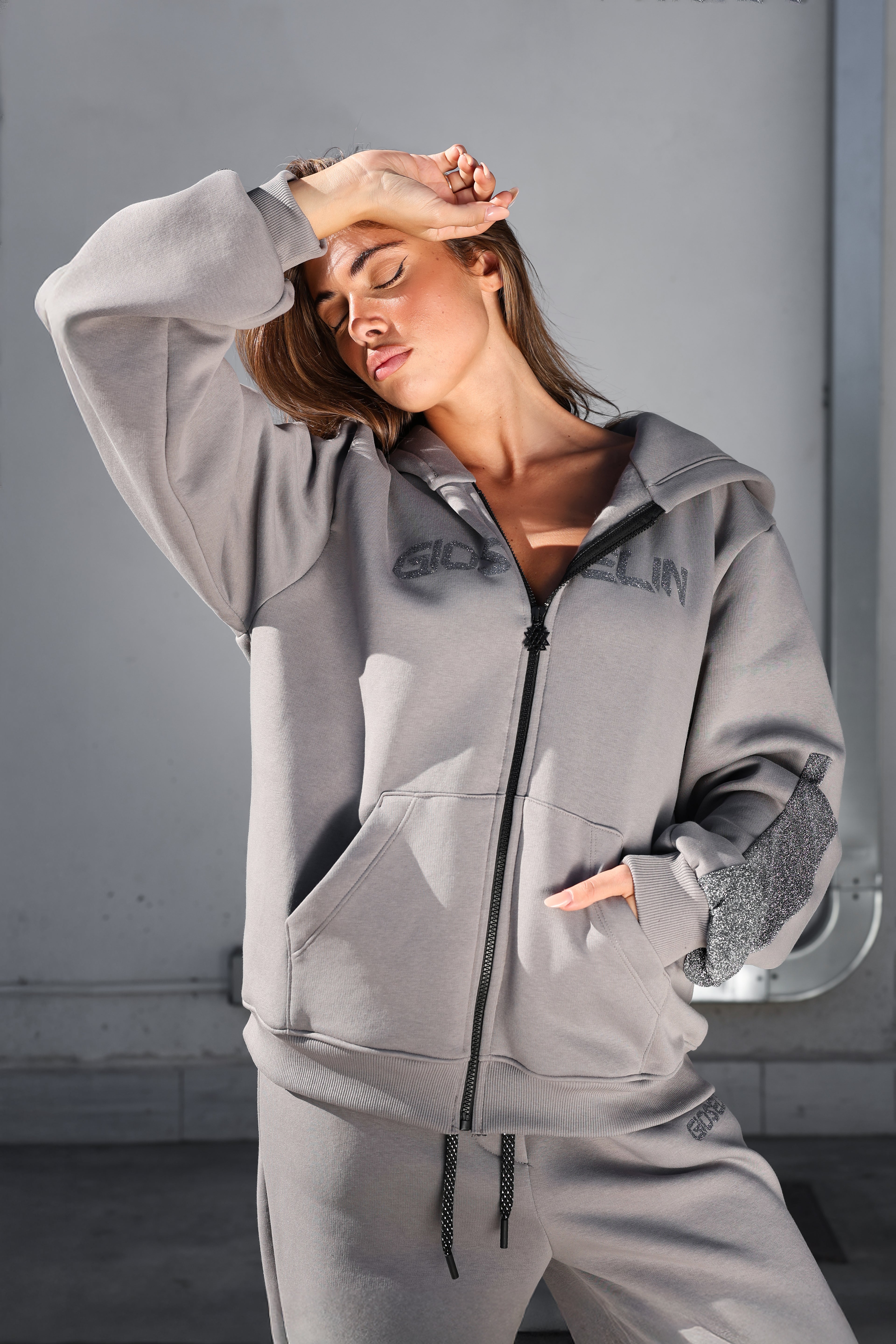 Crafted with a warm fleece interior , it envelops the body in a soft feel, ideal for the winter season. The sweatshirt features a hood, front pockets, and an elastic waistband , ensuring a comfortable and modern fit. The sleeves, embellished with silver lurex inserts, add a bright and distinctive touch, while the Gioselin lurex lettering on the chest completes the design with a luminous and sophisticated effect.