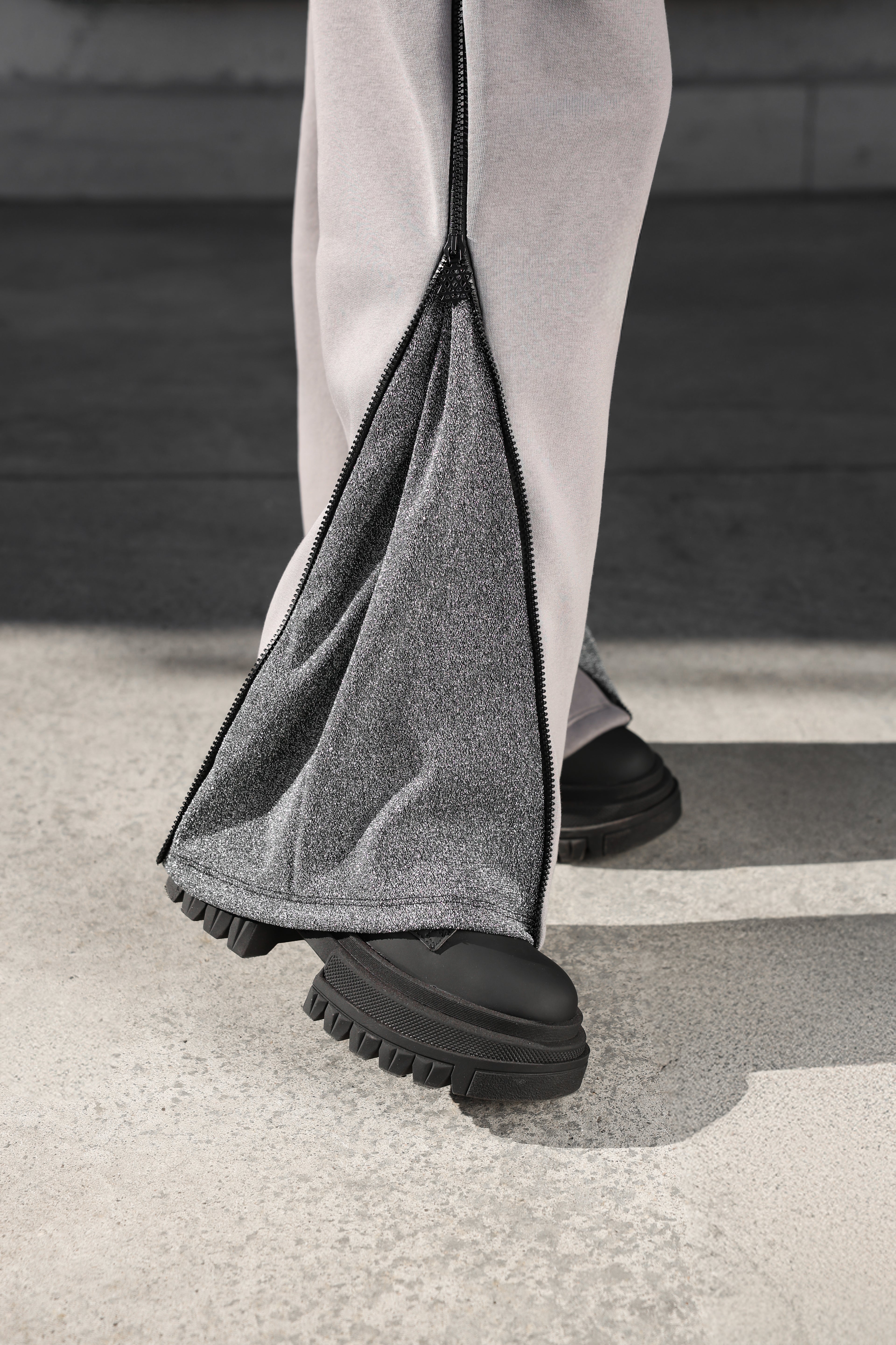 The trousers, wide and comfortable, feature a spring waist with an adjustable drawstring , designed to fit the silhouette perfectly. The iconic element is the side zip , which, when opened, reveals a large internal panel in silver lurex , creating a modern and dramatic contrast.