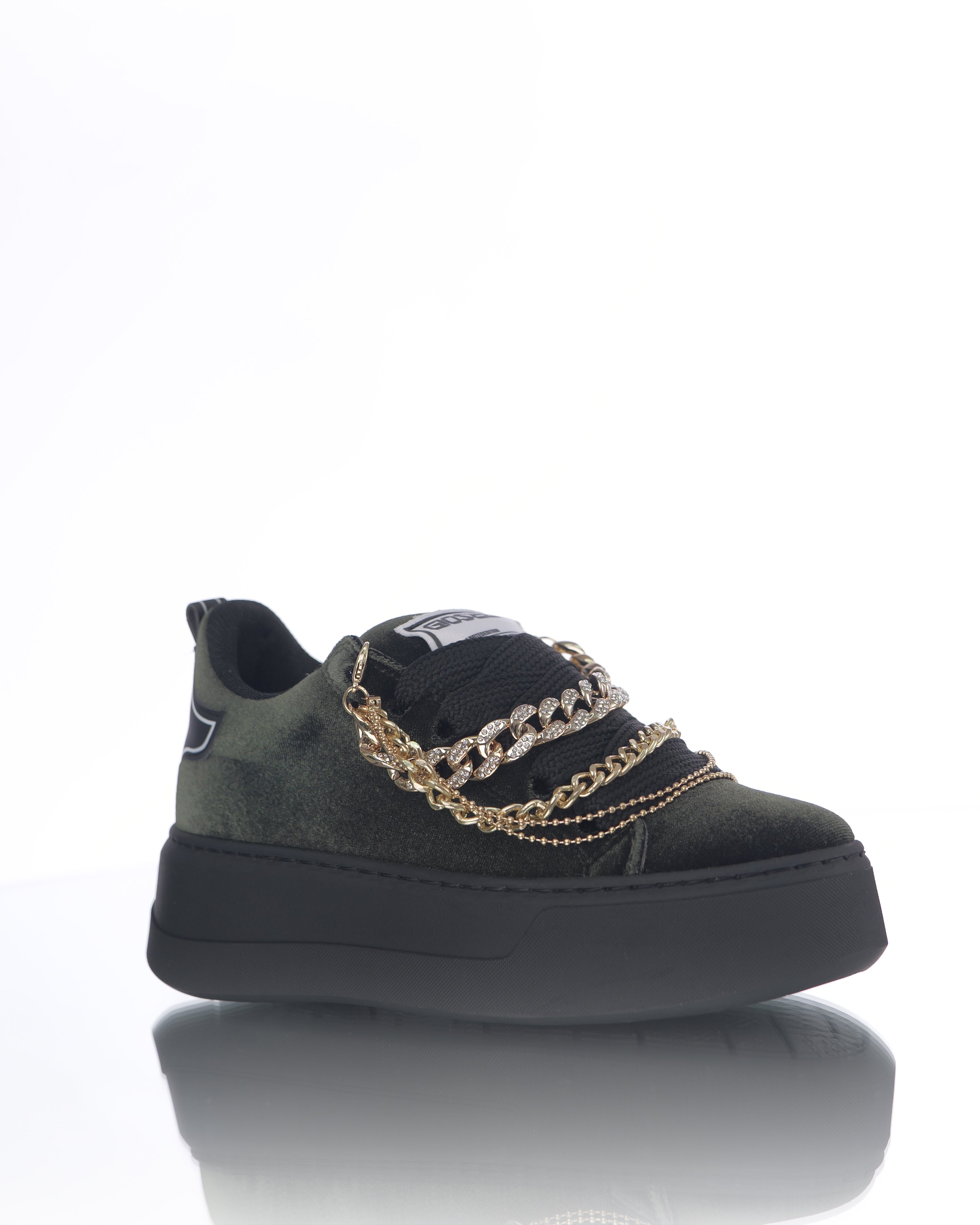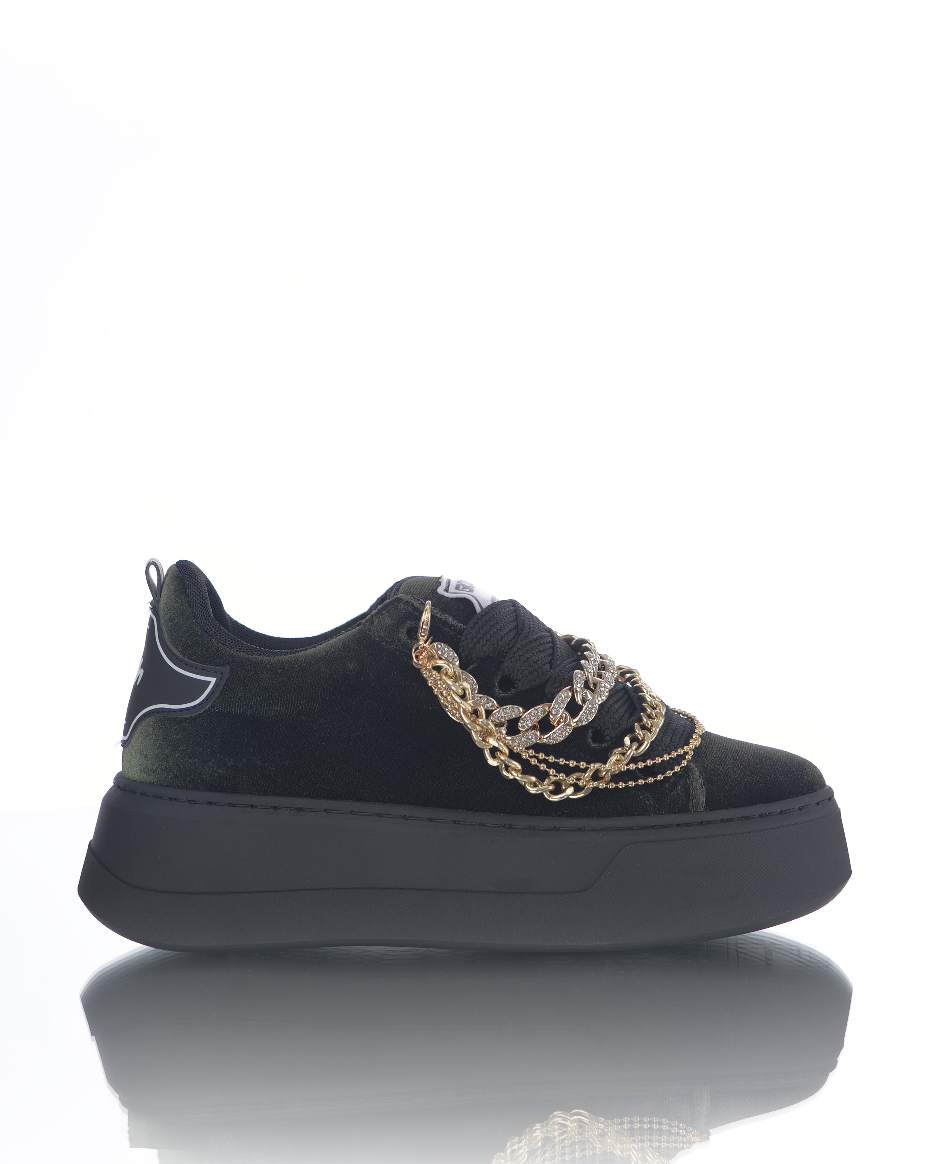 This model takes the winning essence of the Collier and reinterprets it with even more refined materials and details. The velvet base, soft and luxurious, adds a sophisticated touch that perfectly matches the distinctive element that has conquered everyone: the removable chain. Made with golden links and sparkling crystals, this chain, inspired by high jewelry necklaces, transforms the sneaker into a true jewel to wear, capable of enhancing any look.