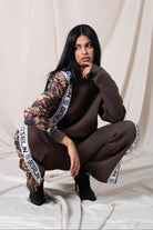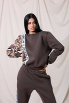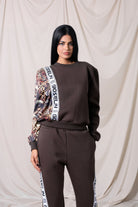 La felpa presenta un taglio moderno con elastico sul fondo e dettagli esclusivi in raso a tema barocco/wild, che donano luminosità e unicità al look. Il pantalone, con elastico in vita, è caratterizzato da un raffinato taglio a zampa che slancia la silhouette mantenendo al tempo stesso la massima comodità.
