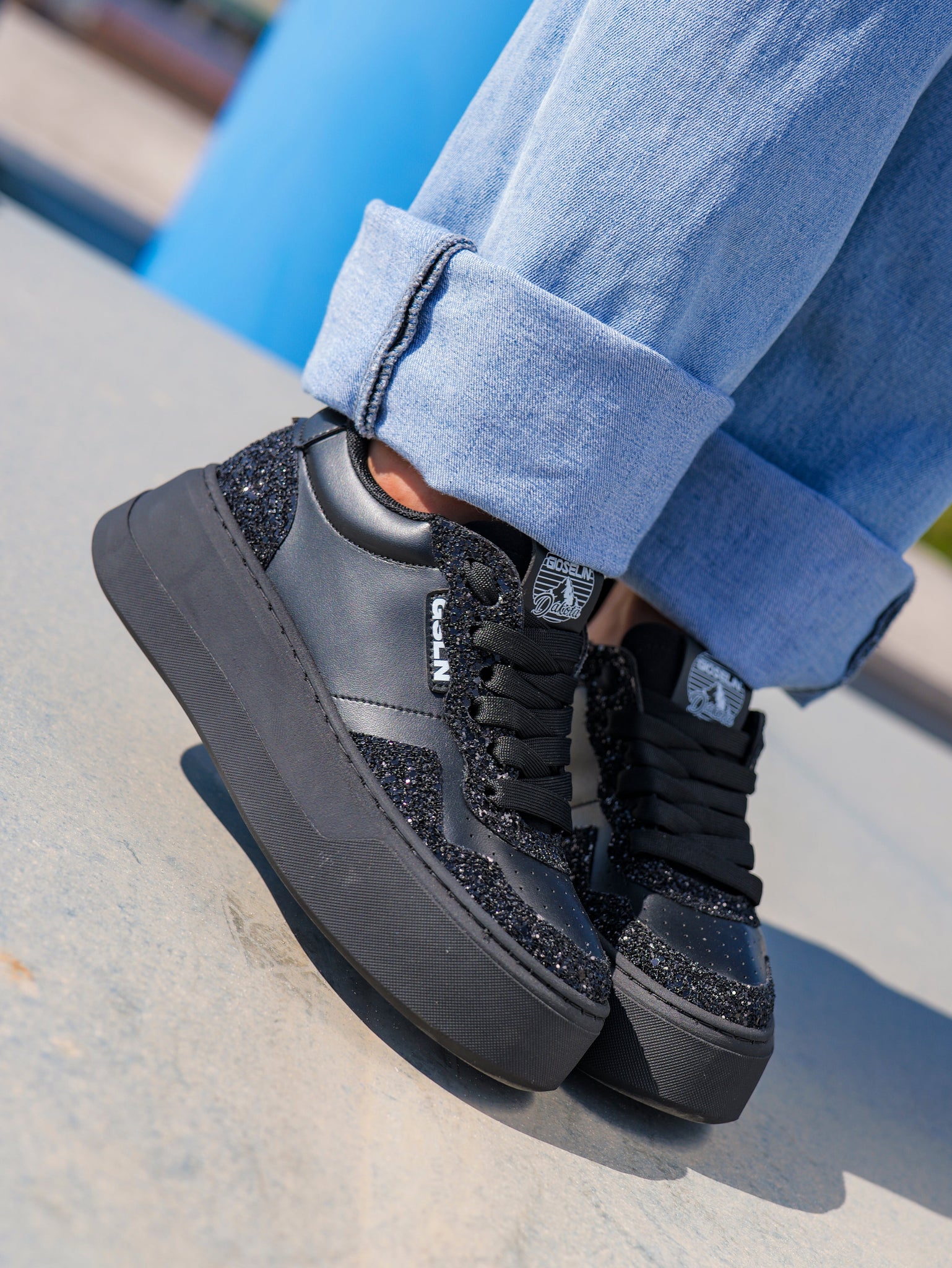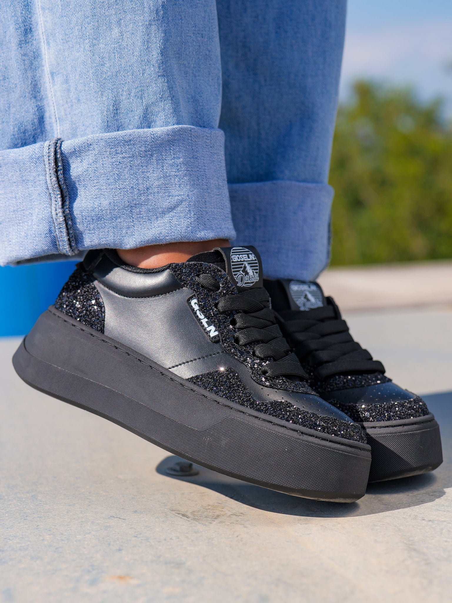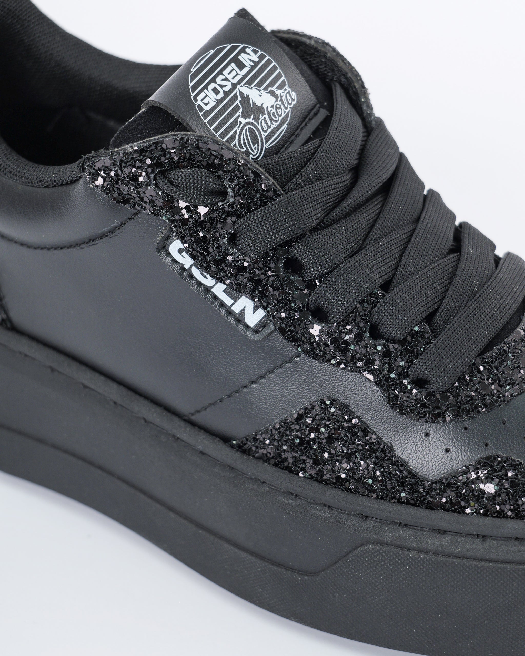Bold, enveloping, and unexpectedly luminous: Dakota Black Glitter is the new all-black interpretation of the iconic Gioselin sneaker. A shoe that redefines the concept of urban glam, combining the absolute depth of black with a cascade of tone-on-tone glitter that reflects the light with subtle, classy detailing.