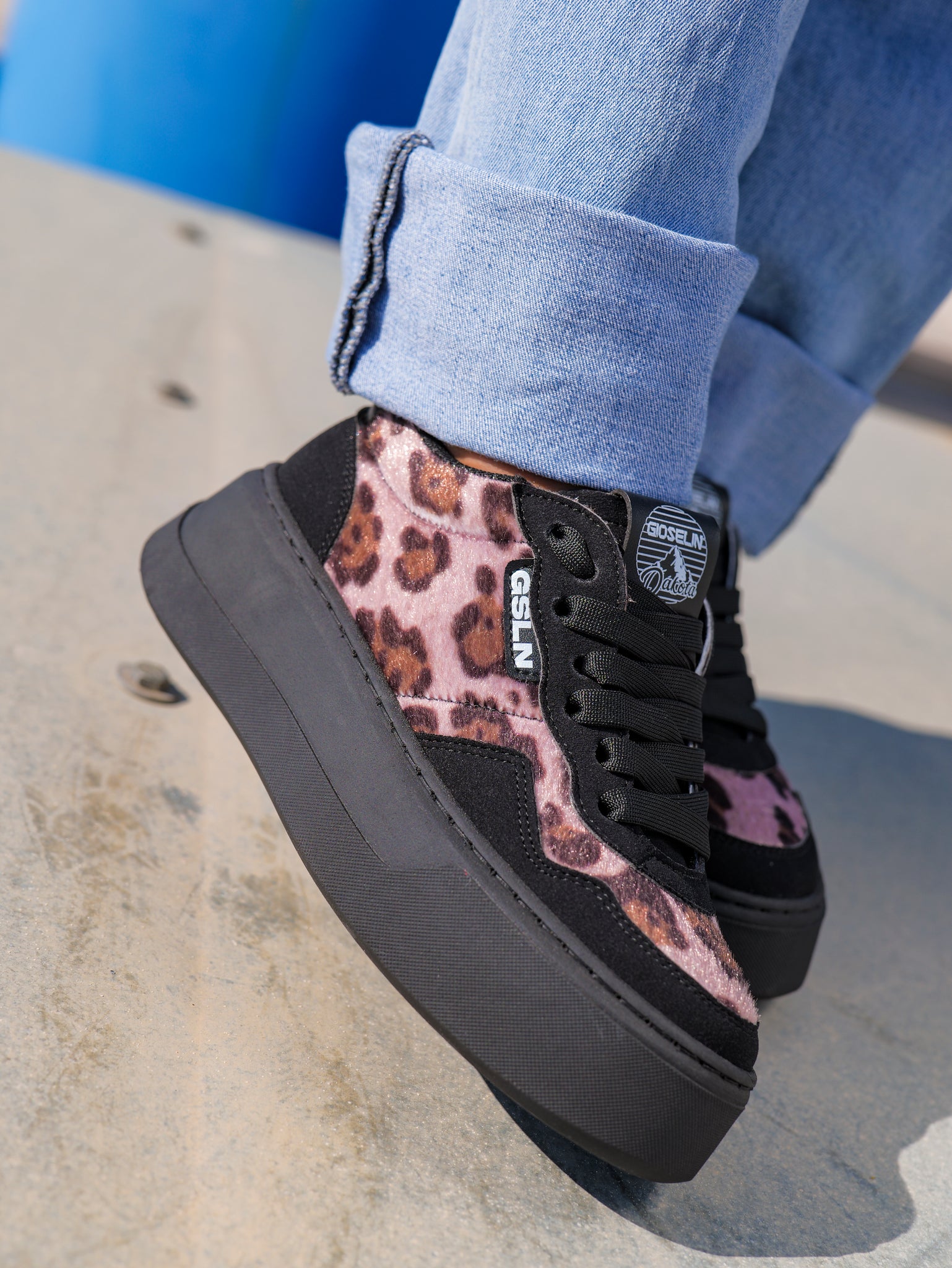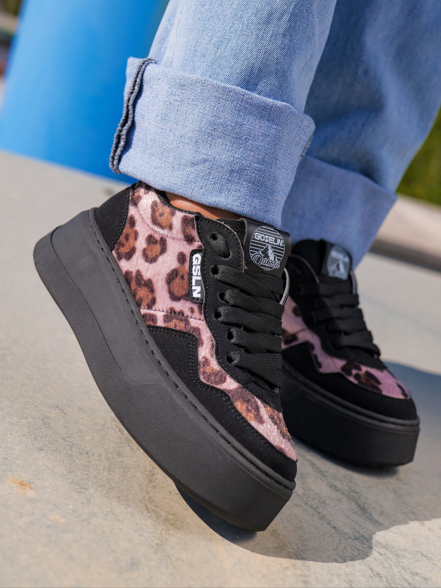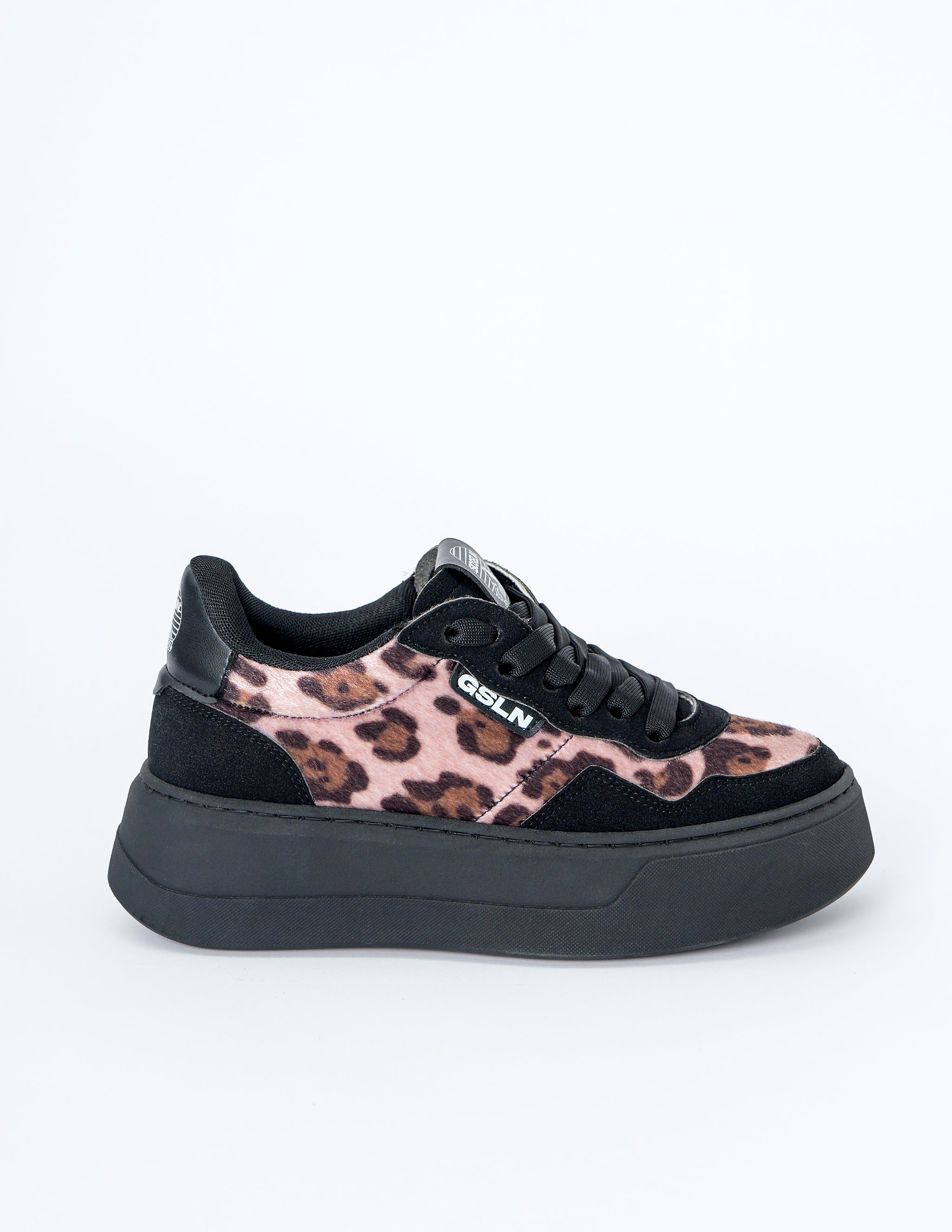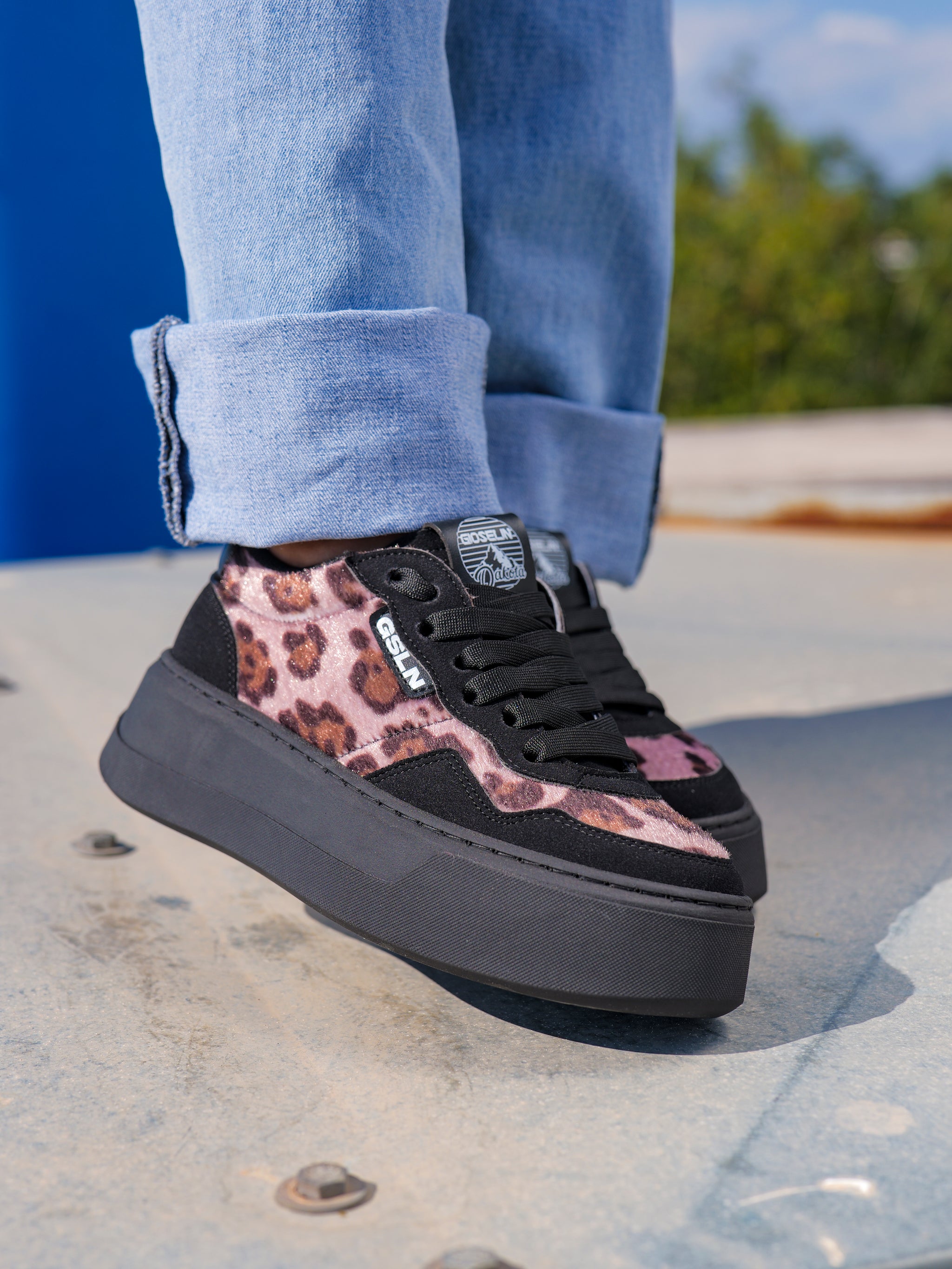 The fur-effect upper is decorated with a spotted pattern in warm, earthy tones, perfectly balanced by the deep black details and the all-black platform sole, which slims the figure without sacrificing comfort. The rich, textured texture lends movement and personality, making every step a statement.