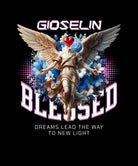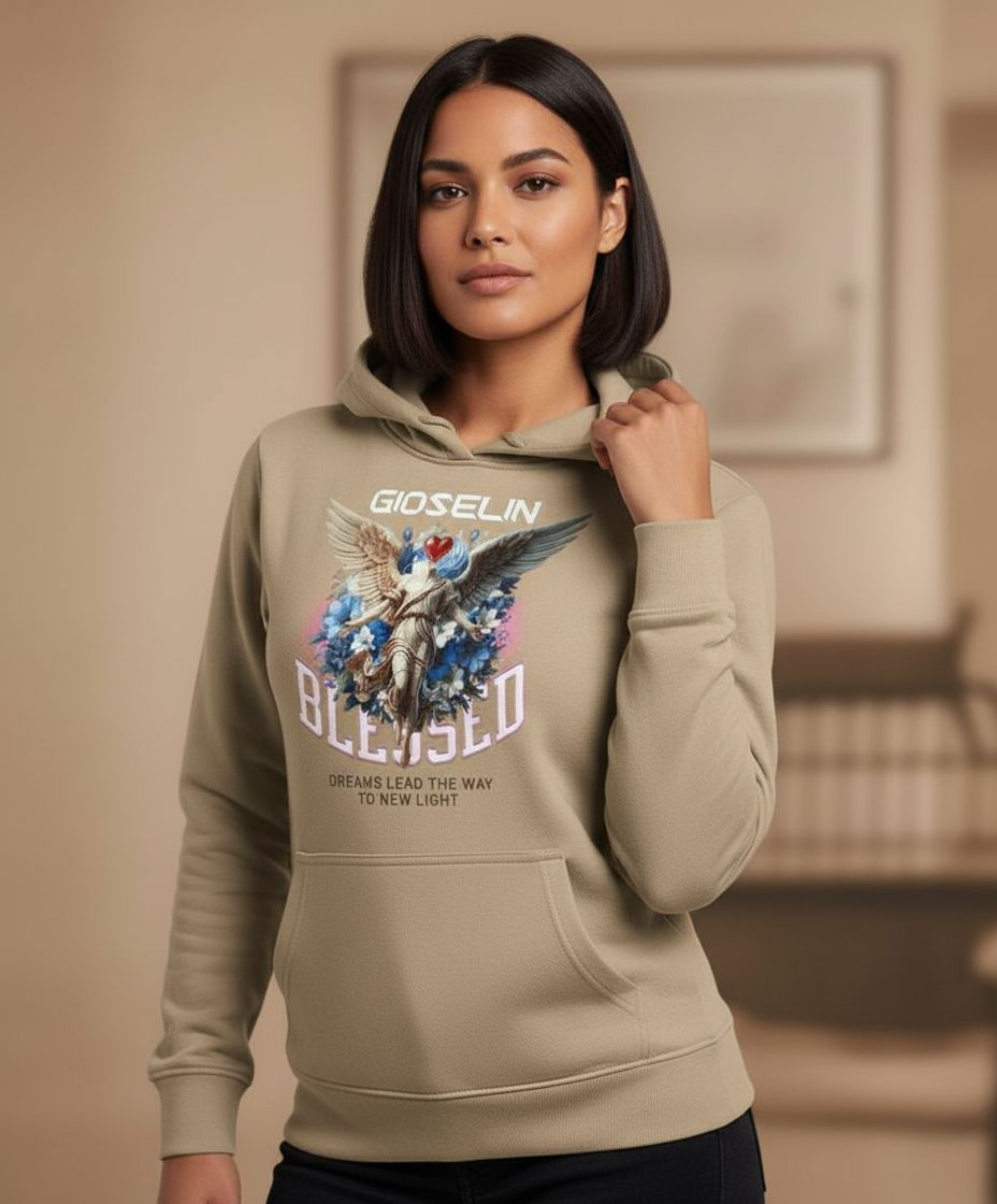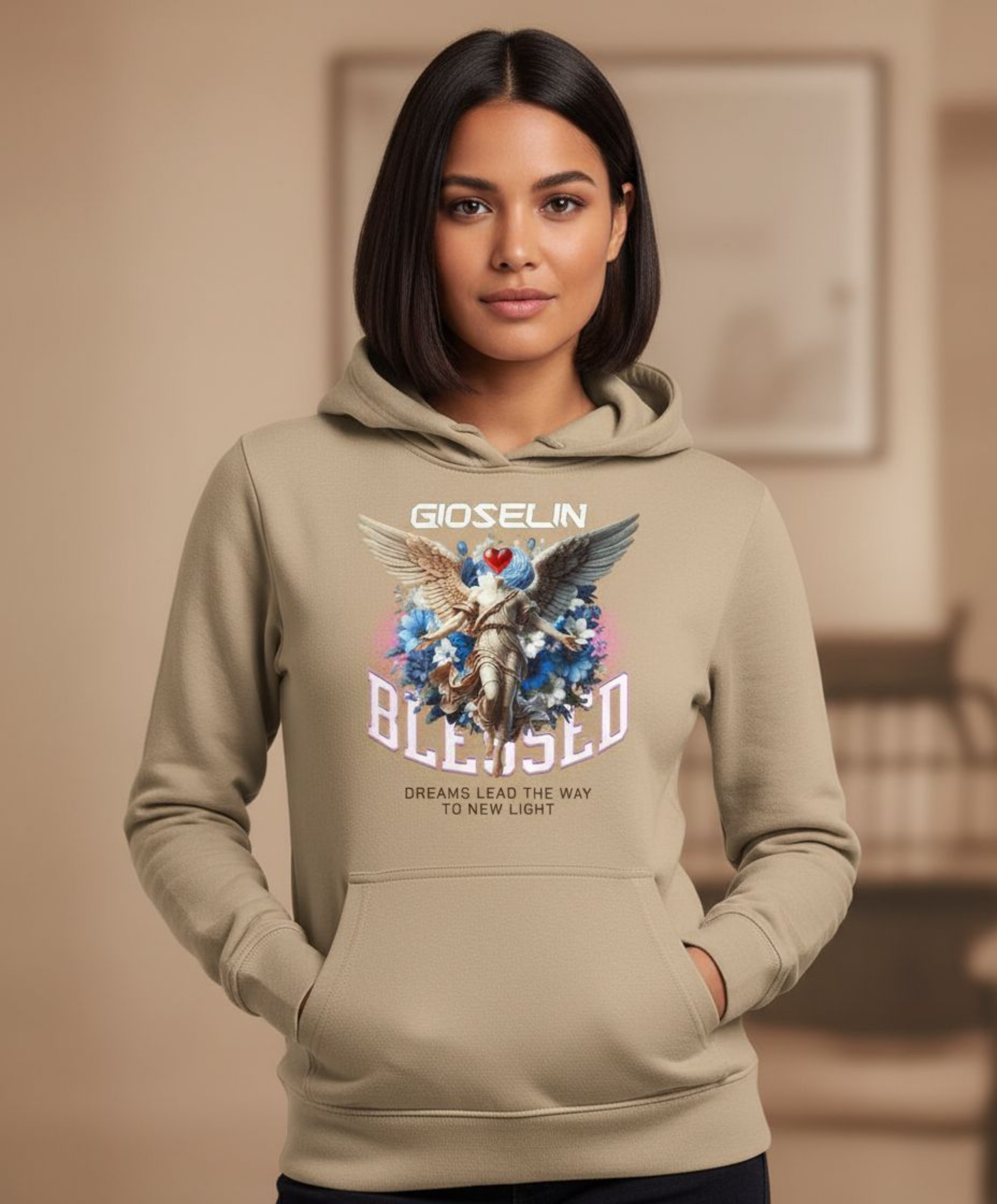 Il motivo centrale raffigura un angelo dalle ali spiegate immerso in una cornice floreale vivace, accompagnato dalla scritta “Blessed – Dreams lead the way to new light”. Un messaggio potente che celebra speranza, sogni e rinascita, trasformando questa felpa in un capo che va oltre lo stile, diventando un simbolo da indossare.