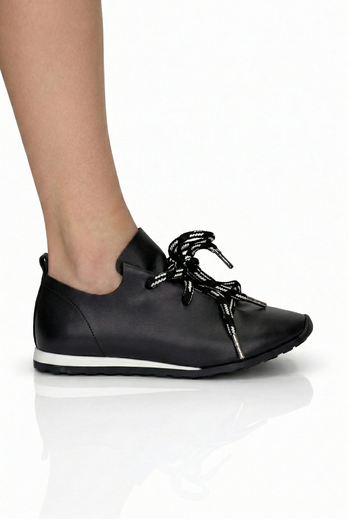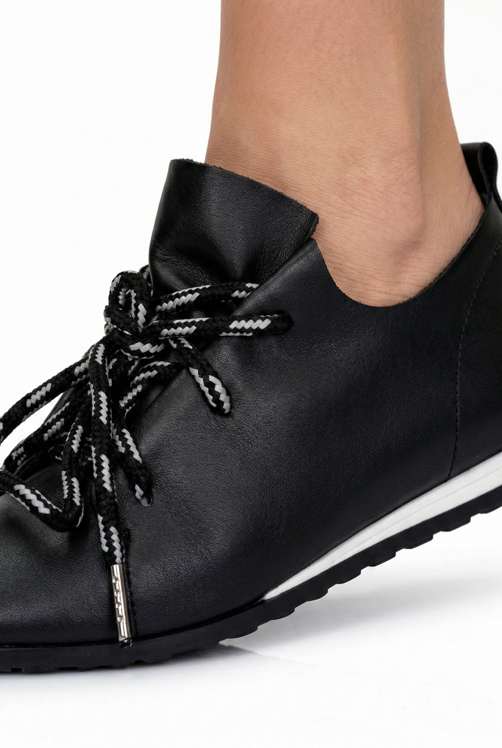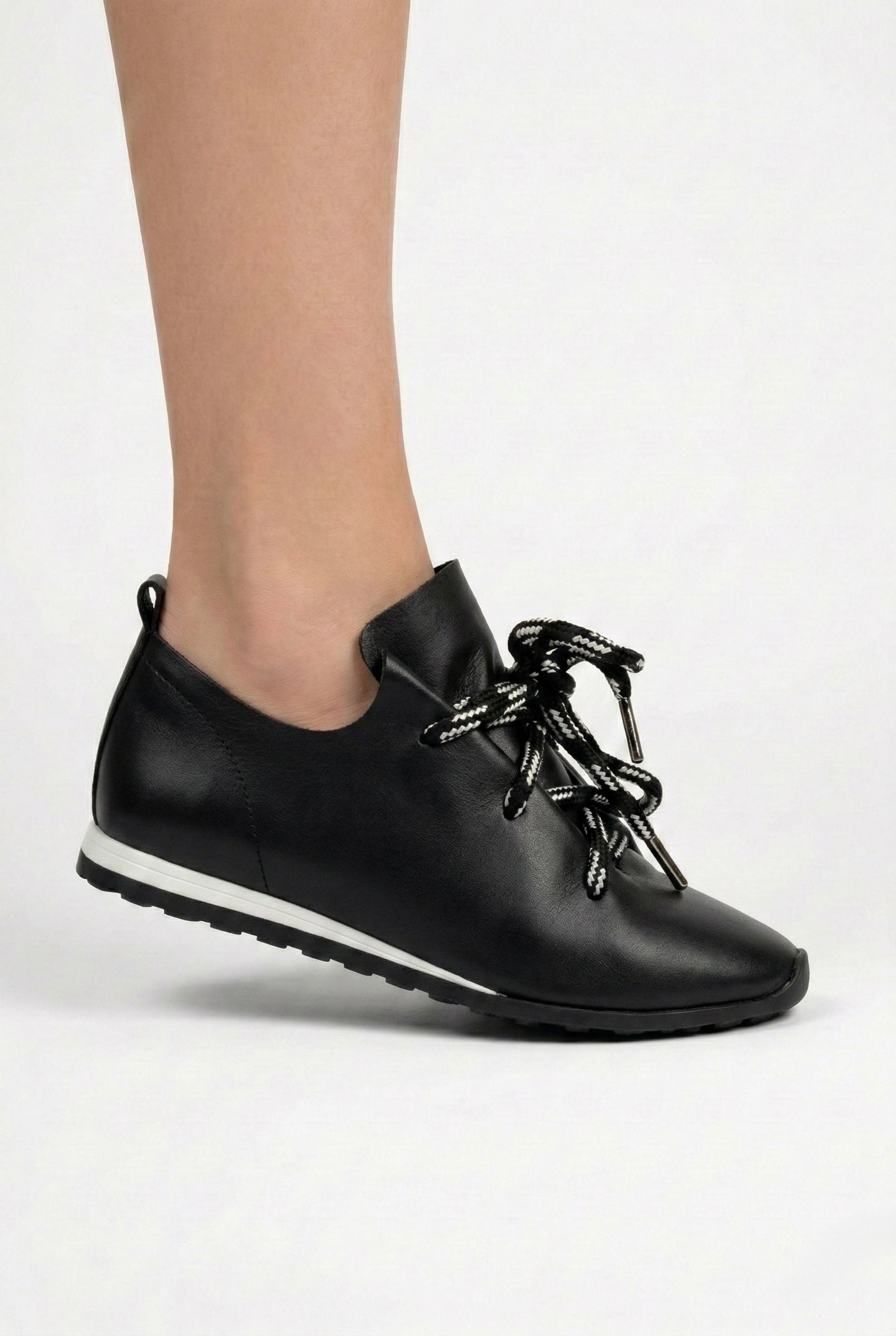 La tomaia morbida e naturale valorizza la texture della pelle attraverso leggere ondulazioni che creano un raffinato gioco di volumi, donando movimento e profondità alla silhouette. Il design essenziale è arricchito da lacci morbidi e strutturati che introducono un dettaglio distintivo, mantenendo un perfetto equilibrio tra semplicità e ricercatezza.