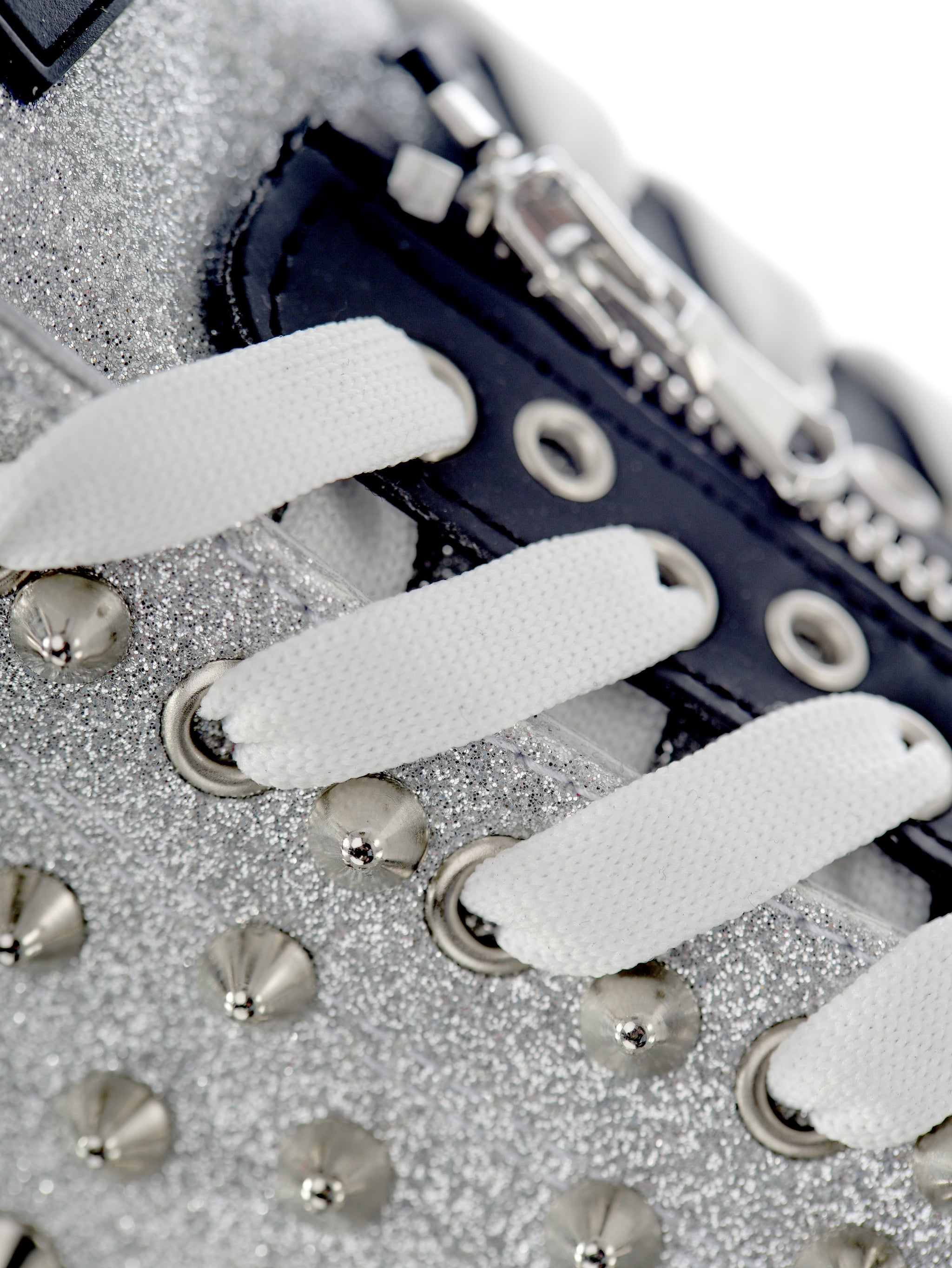 If you want a unique and bold style that will capture attention in every situation, the Glitter Silver Studded Sneakers from the new collection are the ideal choice. With these sneakers, you can never go wrong, because a touch of sparkle and a pinch of originality can make the difference in your wardrobe.