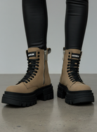 Il gambale alto 16 cm slancia la silhouette, mentre la suola chunky di 8 cm dona altezza e stabilità, esaltando lo stile deciso del modello. La suola zigrinata antiscivolo garantisce trazione e sicurezza su ogni superficie.