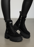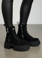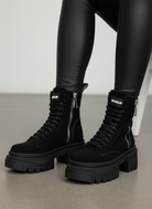 Il gambale alto 16 cm conferisce slancio e struttura al design, mentre la suola chunky di 8 cm aggiunge altezza, stabilità e un’impronta grintosa al look. La suola zigrinata antiscivolo è progettata per offrire sicurezza e trazione su qualsiasi superficie.