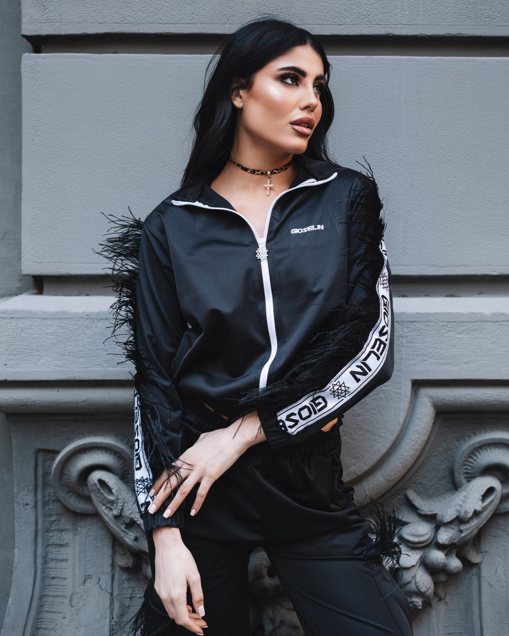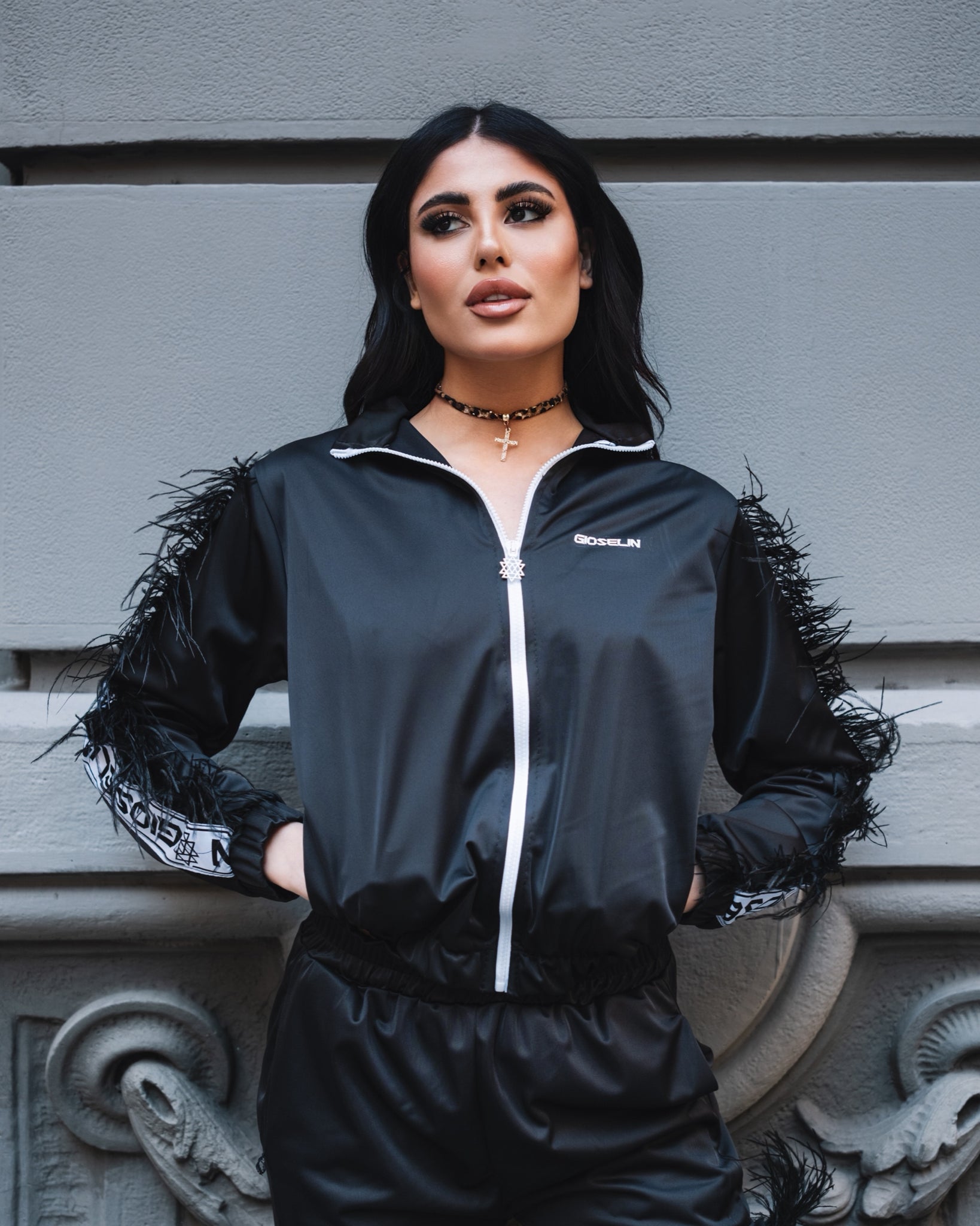 Il design si distingue per le applicazioni in piuma lungo le maniche, elemento distintivo che dona personalità, volume e un’allure fashion contemporanea. Le bande laterali con logo Gioselin rafforzano l’identità del brand e aggiungono un contrasto deciso e moderno.