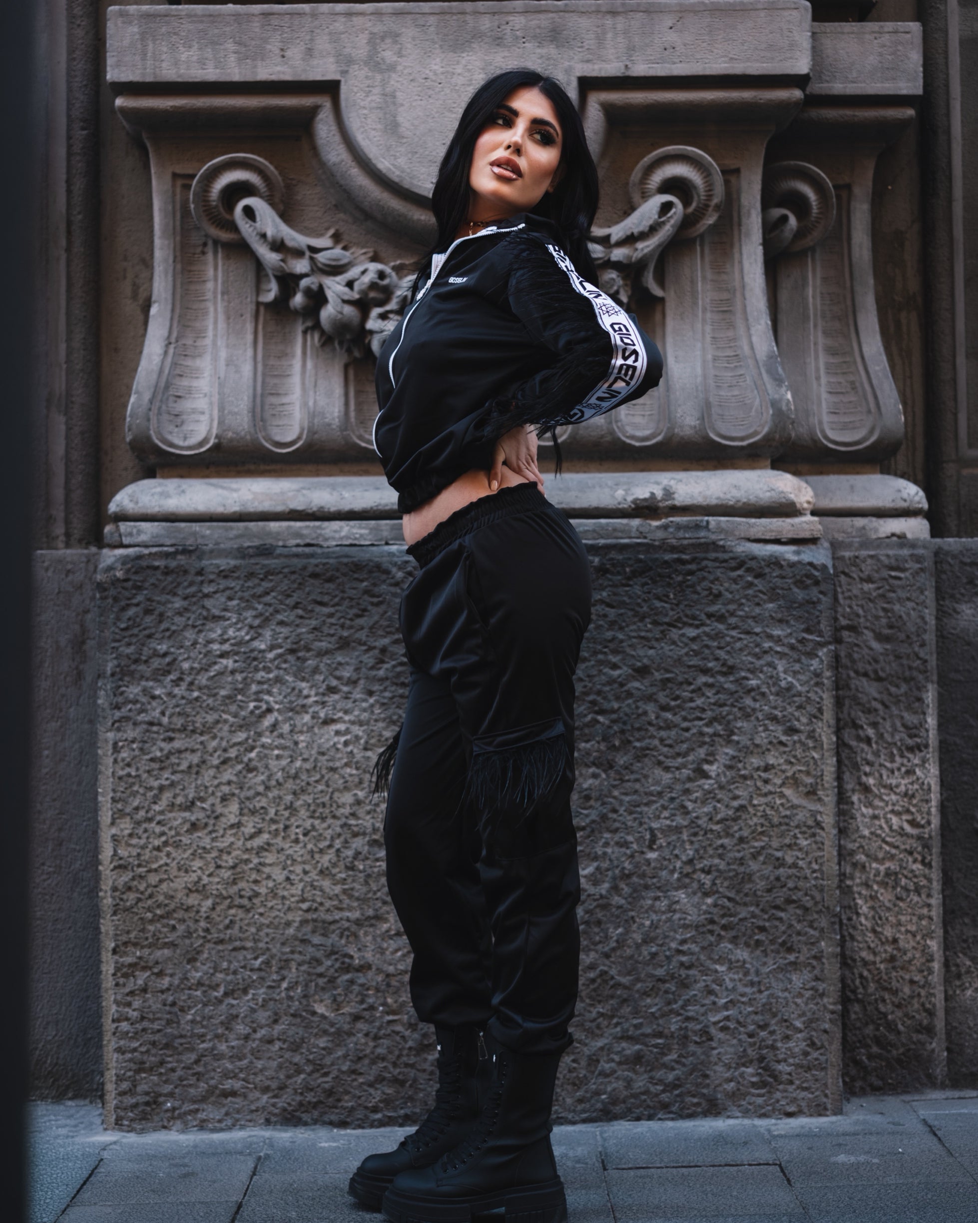 La Tuta Plume Gioselin nasce per chi ama unire carattere e femminilità in un unico look iconico. Un completo che reinterpreta lo streetwear in chiave sofisticata, con dettagli couture che trasformano un outfit sporty in una dichiarazione di stile.